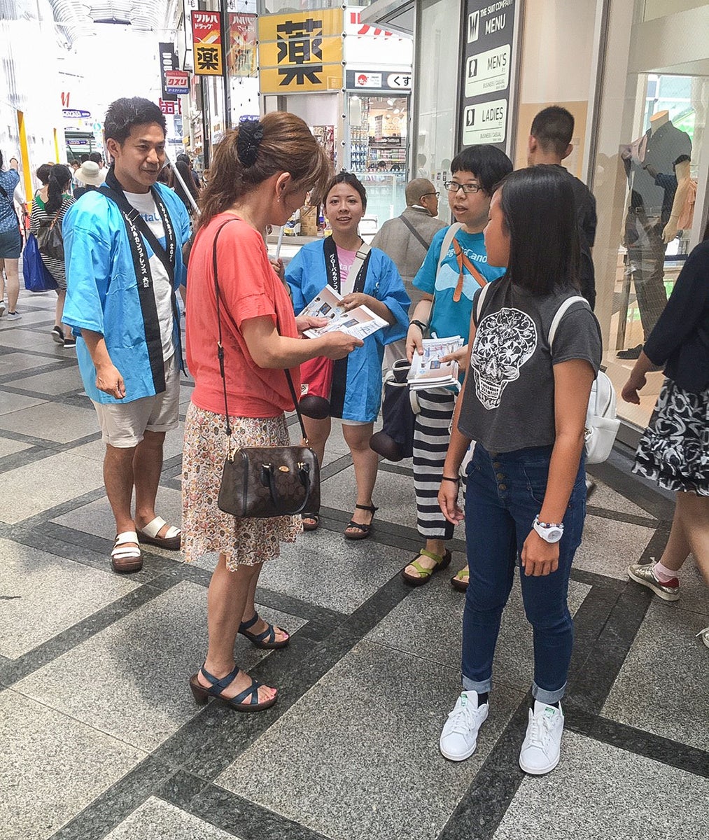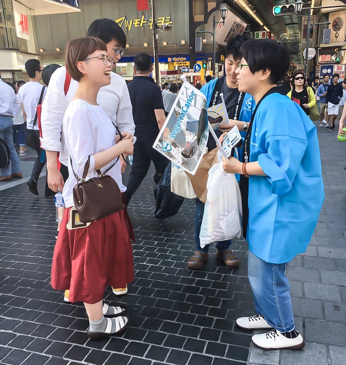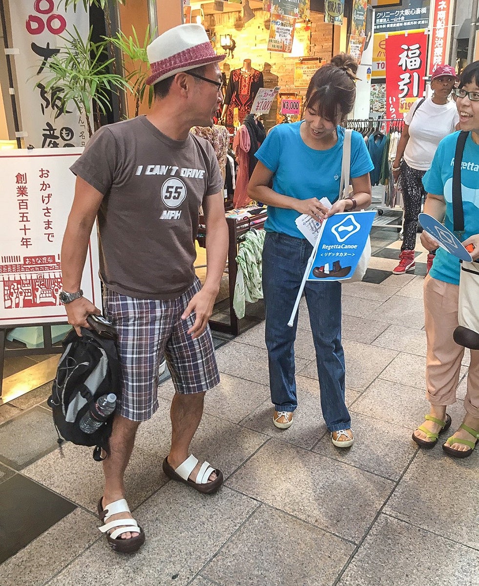 2025年の「ありパレ」は、心斎橋・梅田・天王寺など大阪中心部に加え、神戸・三ノ宮を含む全8エリアで実施。当社スタッフ43名がオリジナルTシャツを着用し、街を歩きながらリゲッタ製品をご愛用の方を見つけ、感謝の言葉とともに「ルーペインソール」を直接お渡しします。