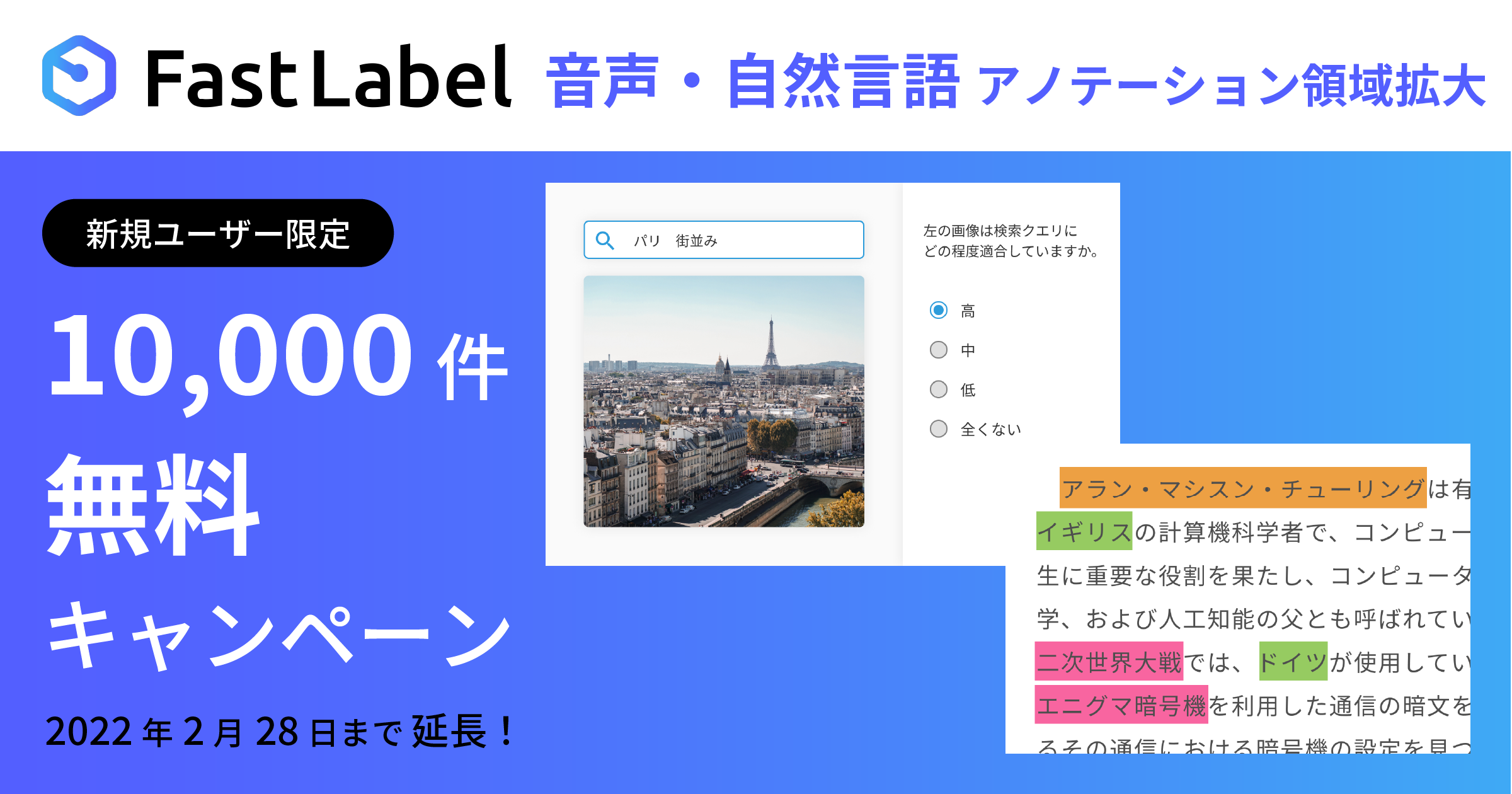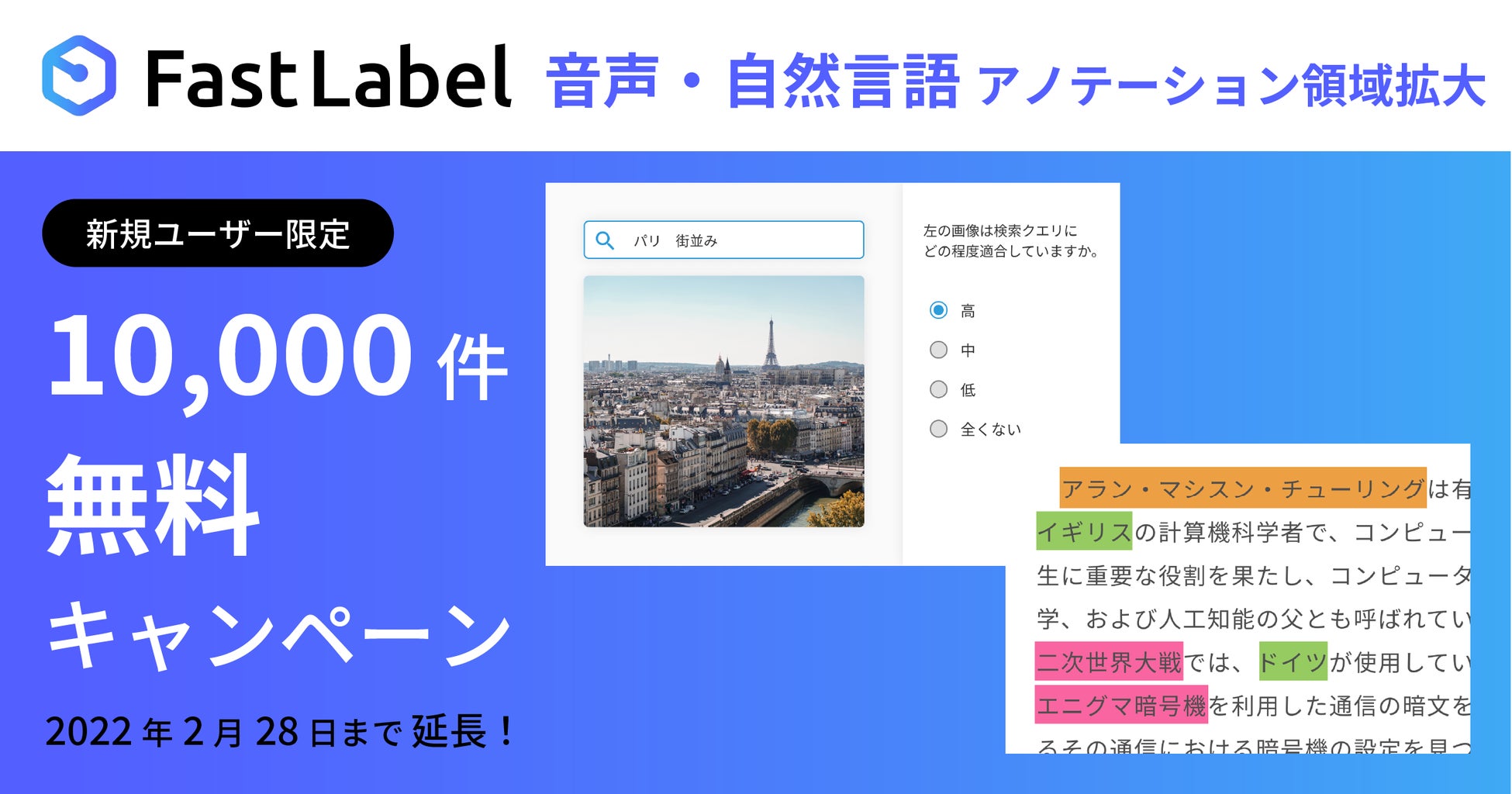 それに伴い、1万件以上のアノテーションに対して最大10万円割引となる1万件無料キャンペーンの期間を延長することをお知らせします。本キャンペーンは2021年9月1日から11月30日までの期間限定で実施していましたが、この度、好評につき2022年2月28まで期間を延長いたします。