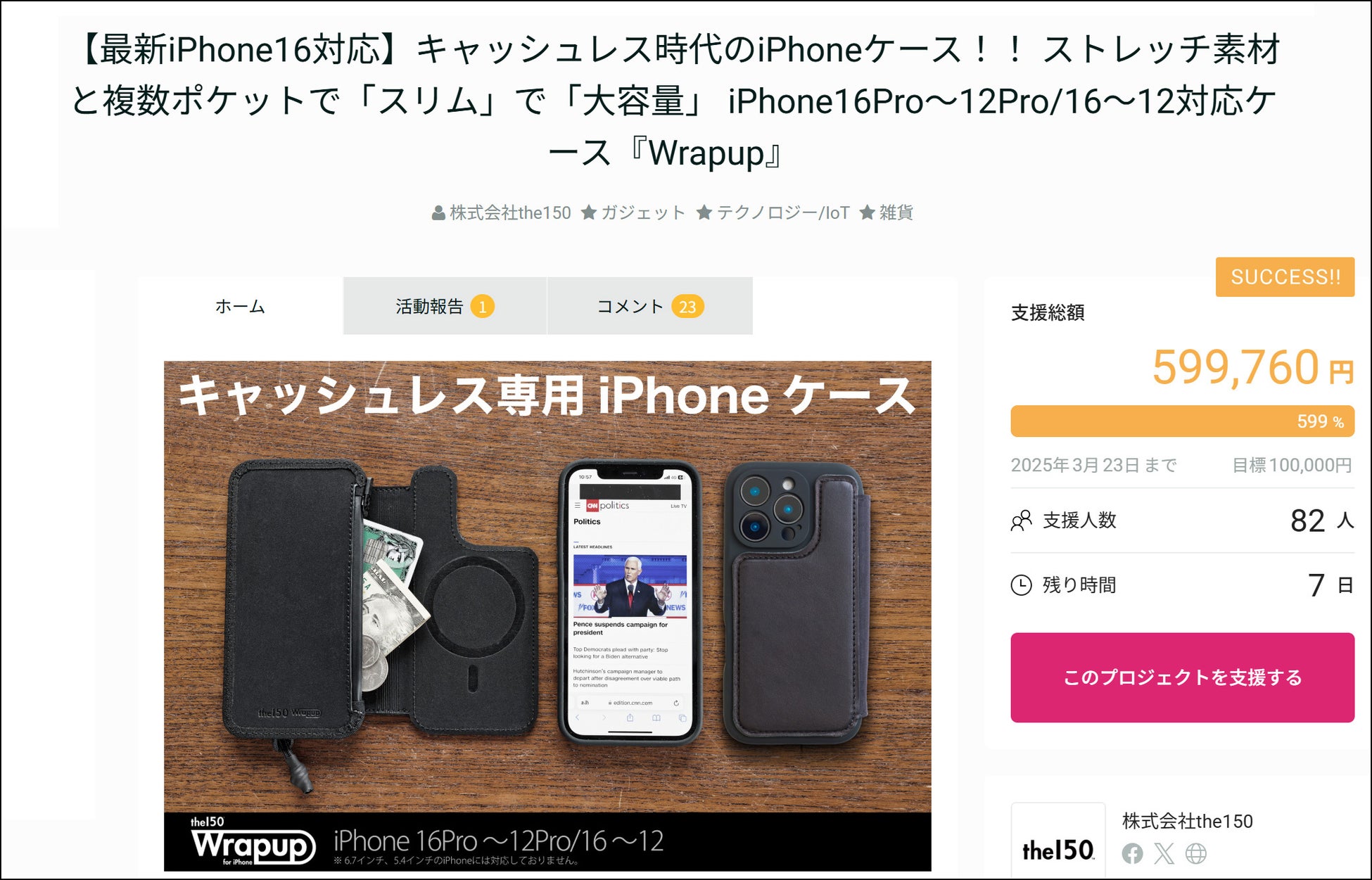 【クラウドファンディング 500% 達成!】”スリムかつ大容量”な財布一体型iPhoneケース「Wrapup」(栃木レザ―仕様)、GREEN FUNDING先行販売は3月23日(日)23:59まで。