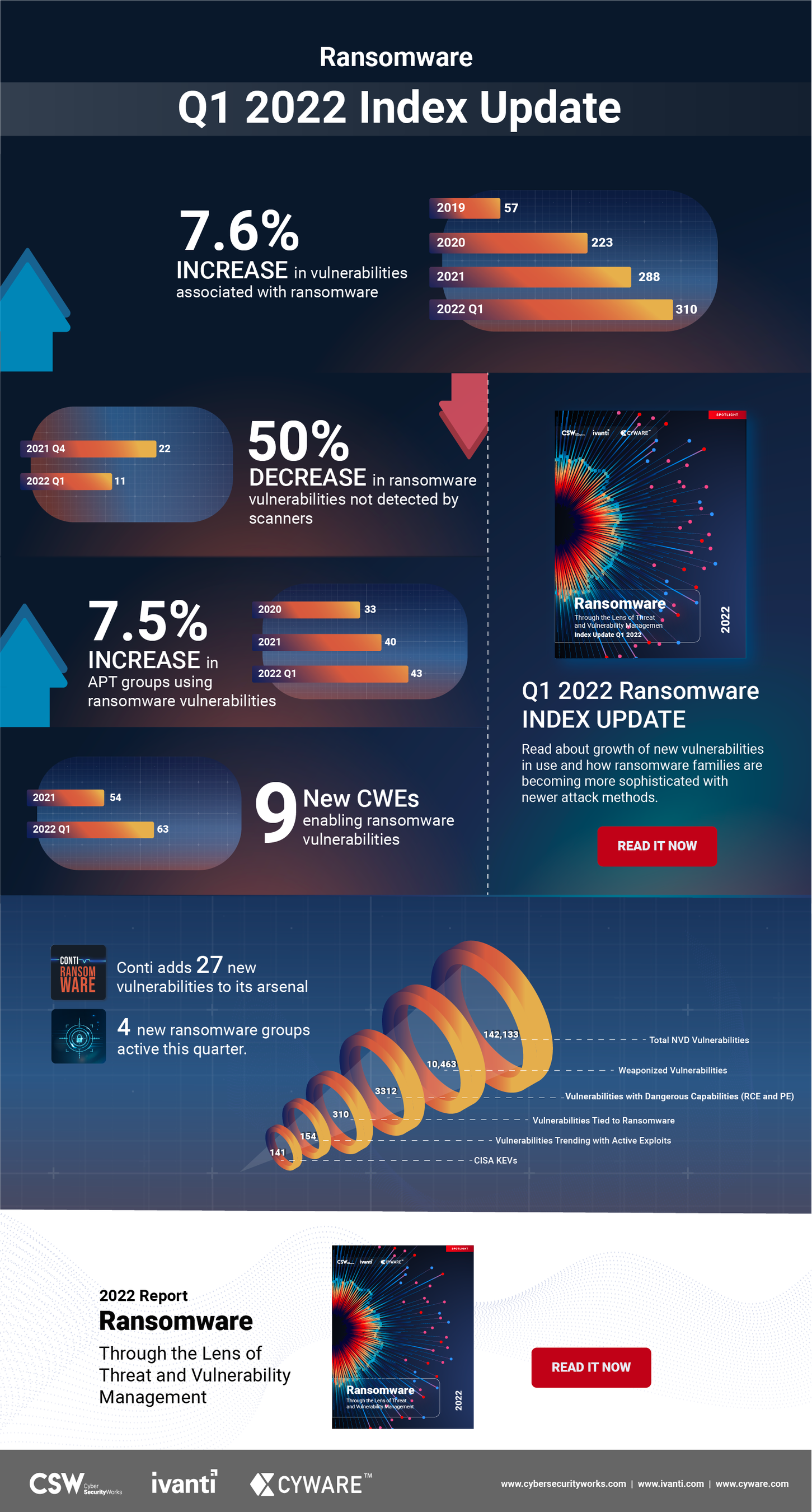 Ivanti、2022年第1四半期ランサムウェアレポートを発表、ランサムウェアにランサムウェアに関連する脆弱性が7.6%増加ランサムウェアグループ、「Conti」の活動急増が明らかに