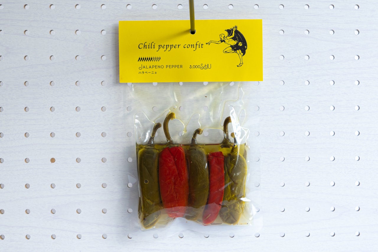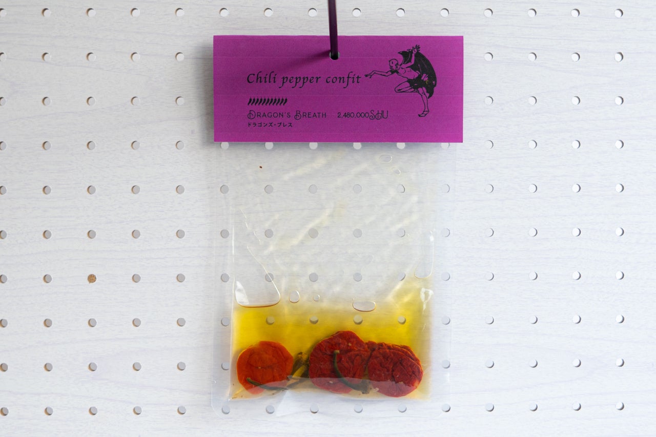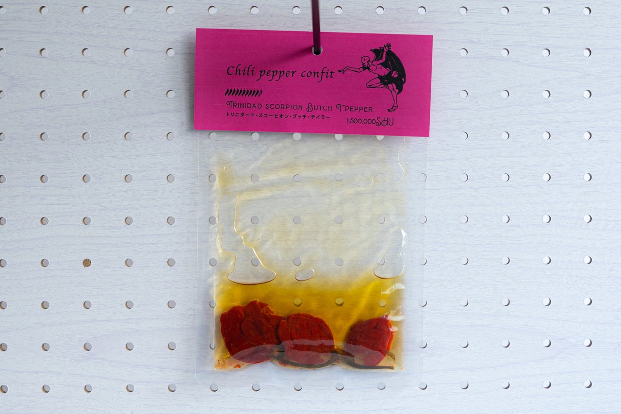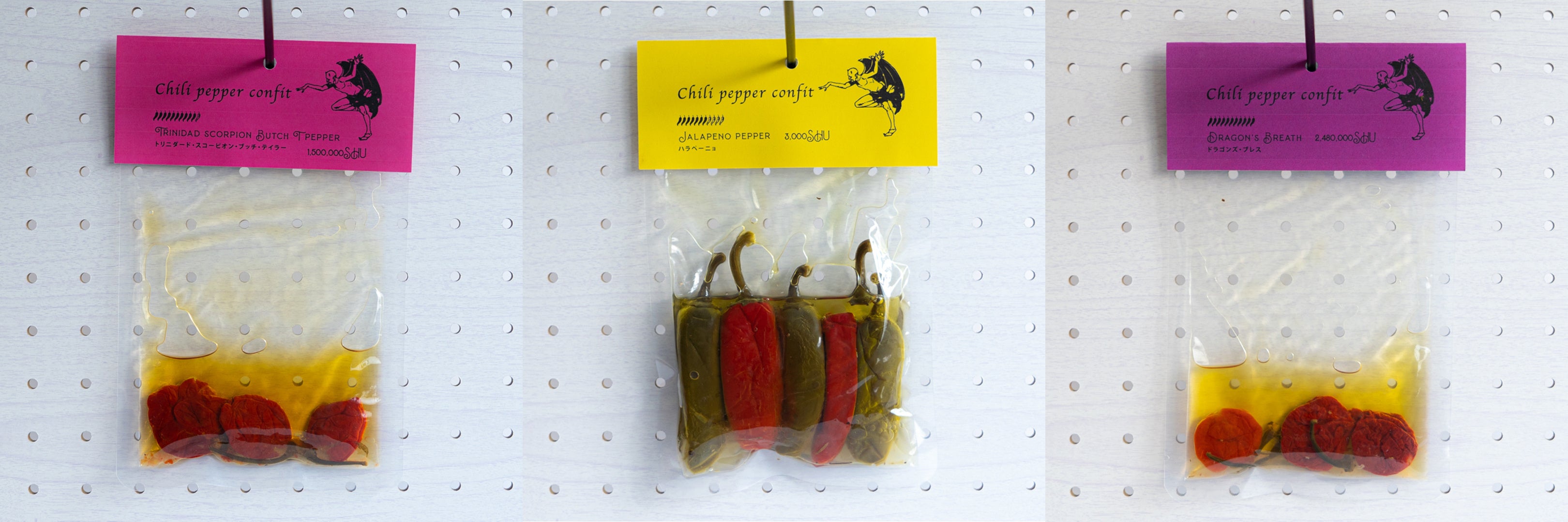 激辛党でなくても食べれる辛さのチリと、激辛党向けのチリをご用意。特製の香草オイルでコンフィに仕上げました。