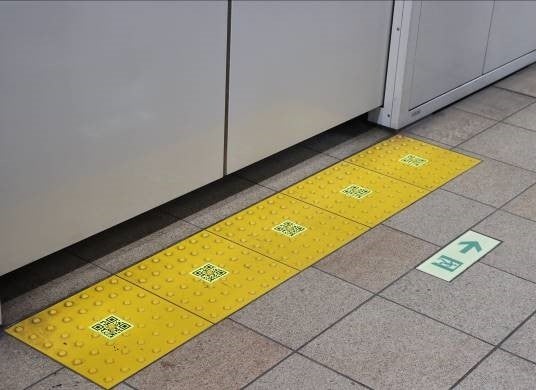 駅構内の点字ブロック上または、その付近にQRコードを設置し、「shikAI」アプリでそのQRコードを読み取ることで、現在地から目的地までの駅構内の移動ルートを導き出し、音声で進む方向や距離を伝えることで、目的地までご案内します。