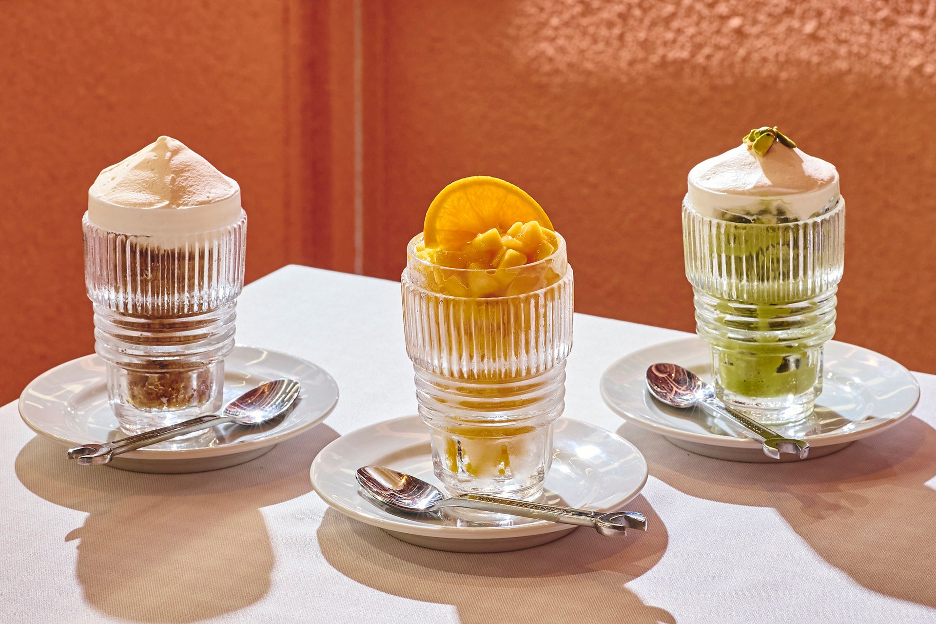 本場イタリアではエスプレッソのグラニータと並び人気のメニュー。上質なピスタチオペーストを使用し、バニラアイスと生クリームをトッピング。濃厚さのあとにすっきりとした味わいが広がります。