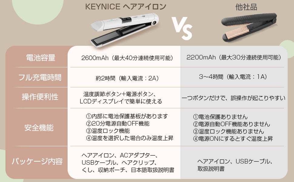 ③ほかのアイロンに比べて、多層保護機能備える:温度ロック機能、自動電源OFF、電池の保護装置など、もっと便利で使用いただけます。