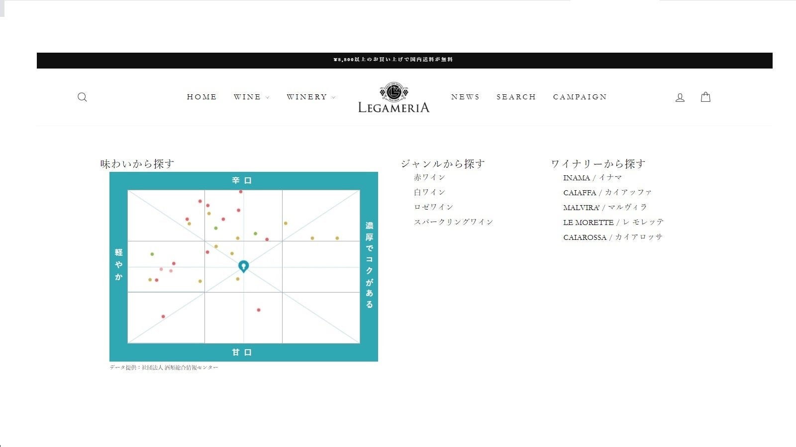 このサービスの特徴は、ワインのECサイトでありながら、味わいを可視化して表現することで失敗せずにワインを購入できるECサイトになっています。約6,000本もの世界各国のワインを、味覚センサー(味覚認識装置)を使って検査し、定量化されたデータをもとに味わいを表現しています。