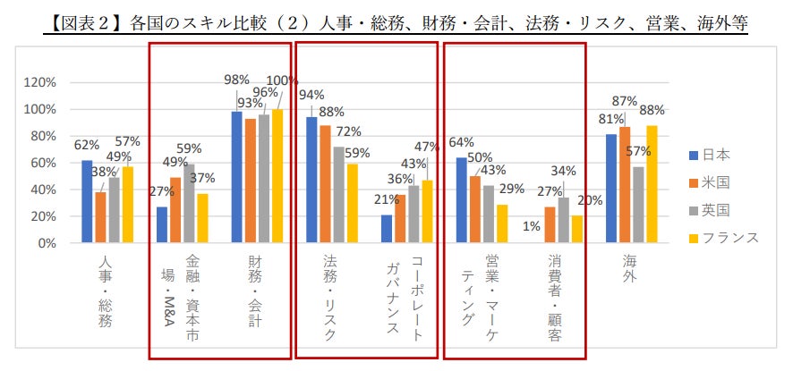 また、「コーポレートガバナンス」も日本に比べ、海外の方が多くの企業でスキルとして認識され ており、最も高いフランスでは半数近い企業でスキルとして置いています。同様のスキルとして「法 務・リスク」が考えられますが、日本ではそのスキルを置く企業が多く、「コーポレートガバナンス」 の割合が低くなる国ほど、「法務・リスク」が高くなっています。
