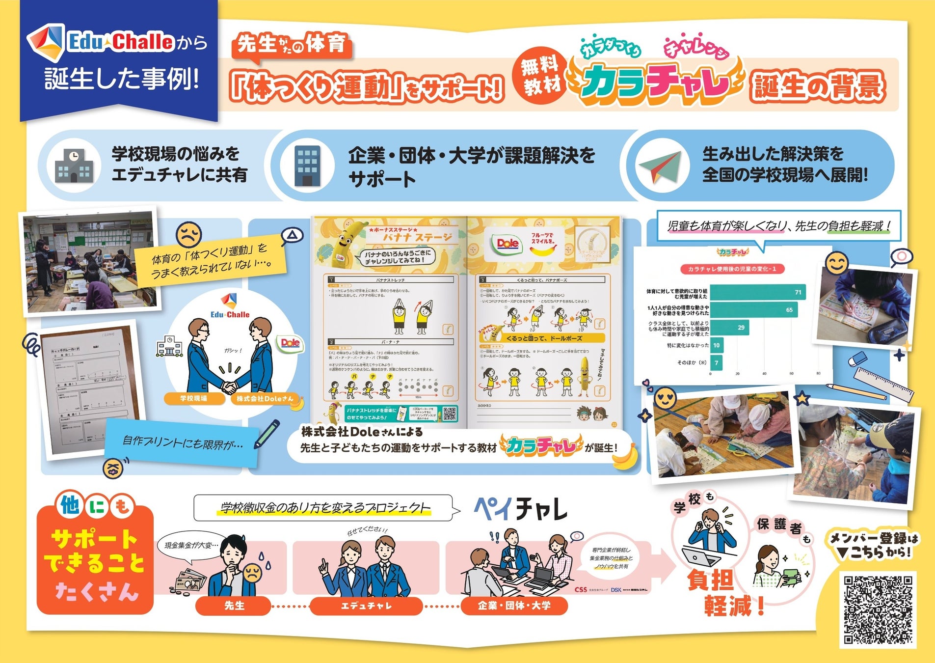 エデュシップはこれまで、学校スポーツ改革の「イマチャレ」、小学校体育の体つくり運動の「カラチャレ」、集金業務のデジタル化を目指す「ペイチャレ」、自己肯定感を高め合う「スキチャレ」などを展開、累計で全国約9,000校の学校現場へ、様々なパートナー様との共創による無償の貢献を広げてきました。