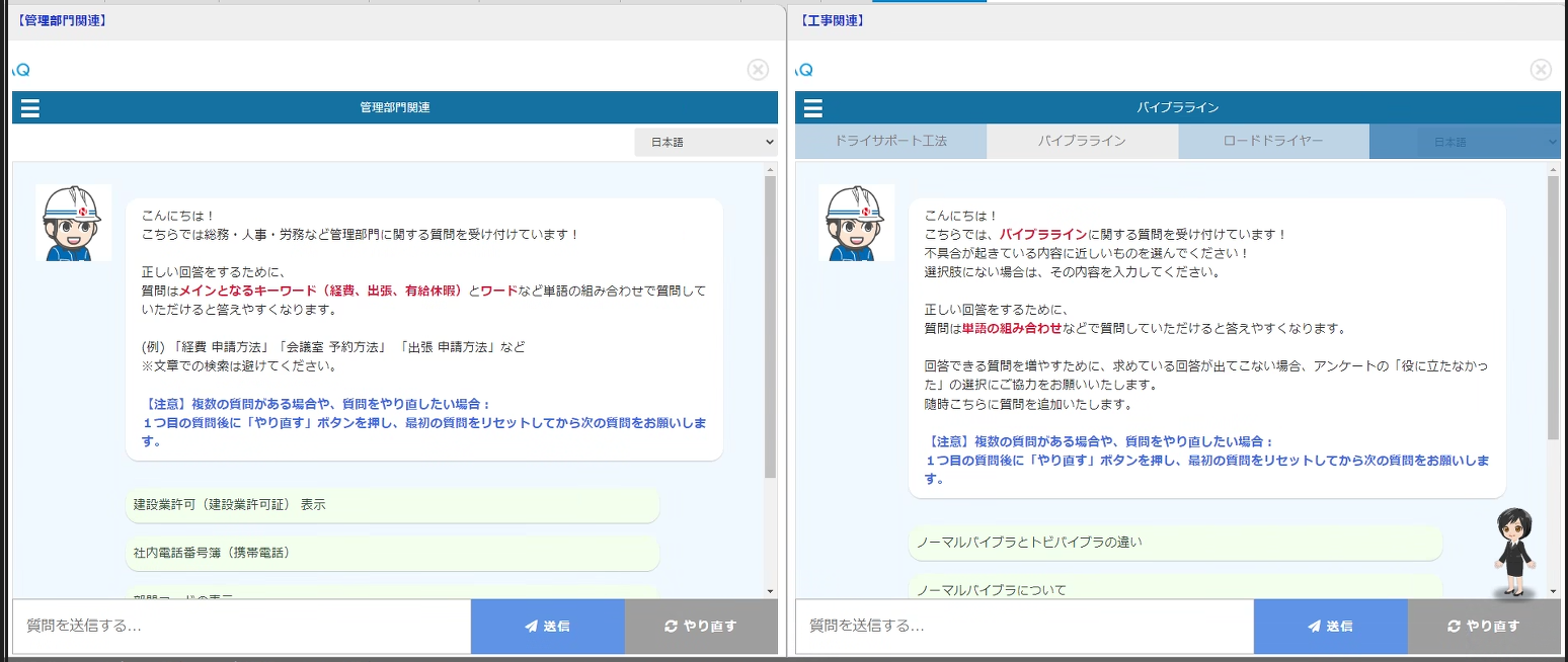 一方で工事は深夜や早朝も動いており、現場の社員にとっては本社や関連部署が稼働していない時間帯には問い合わせをしても回答が得られません。こういった業務の円滑化を目的に、問い合わせに対して即時に自動応答できるチャットボットサービスの導入を検討することになりました。
