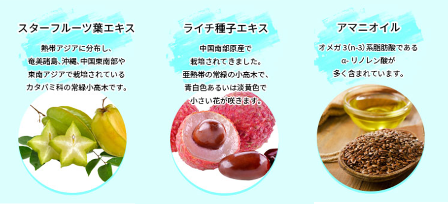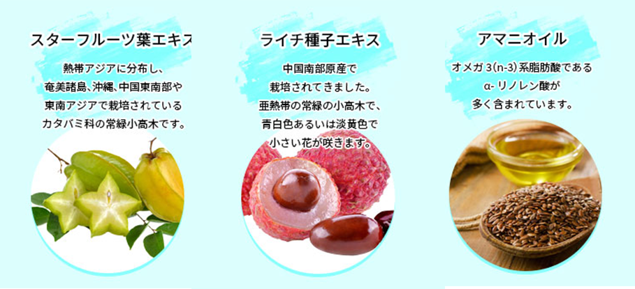 また、パイナップル抽出物・スターフルーツ抽出物・ライチ抽出物のオリジナル配合で特許出願中です。