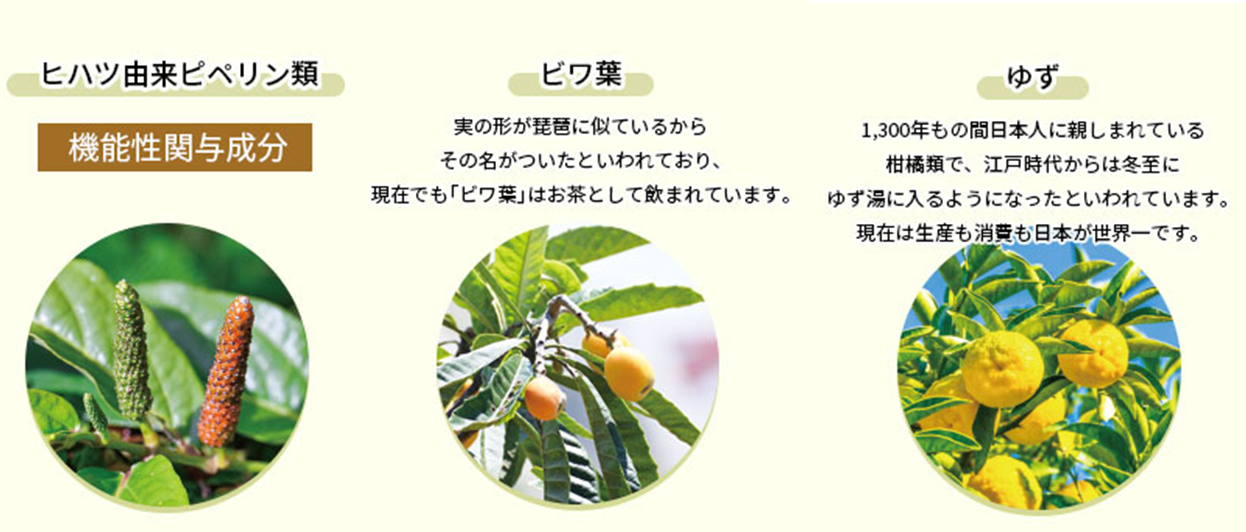 機能性関与成分であるヒハツ由来ピぺリン類・ビワ葉・ゆずのオリジナル配合で特許出願中です。