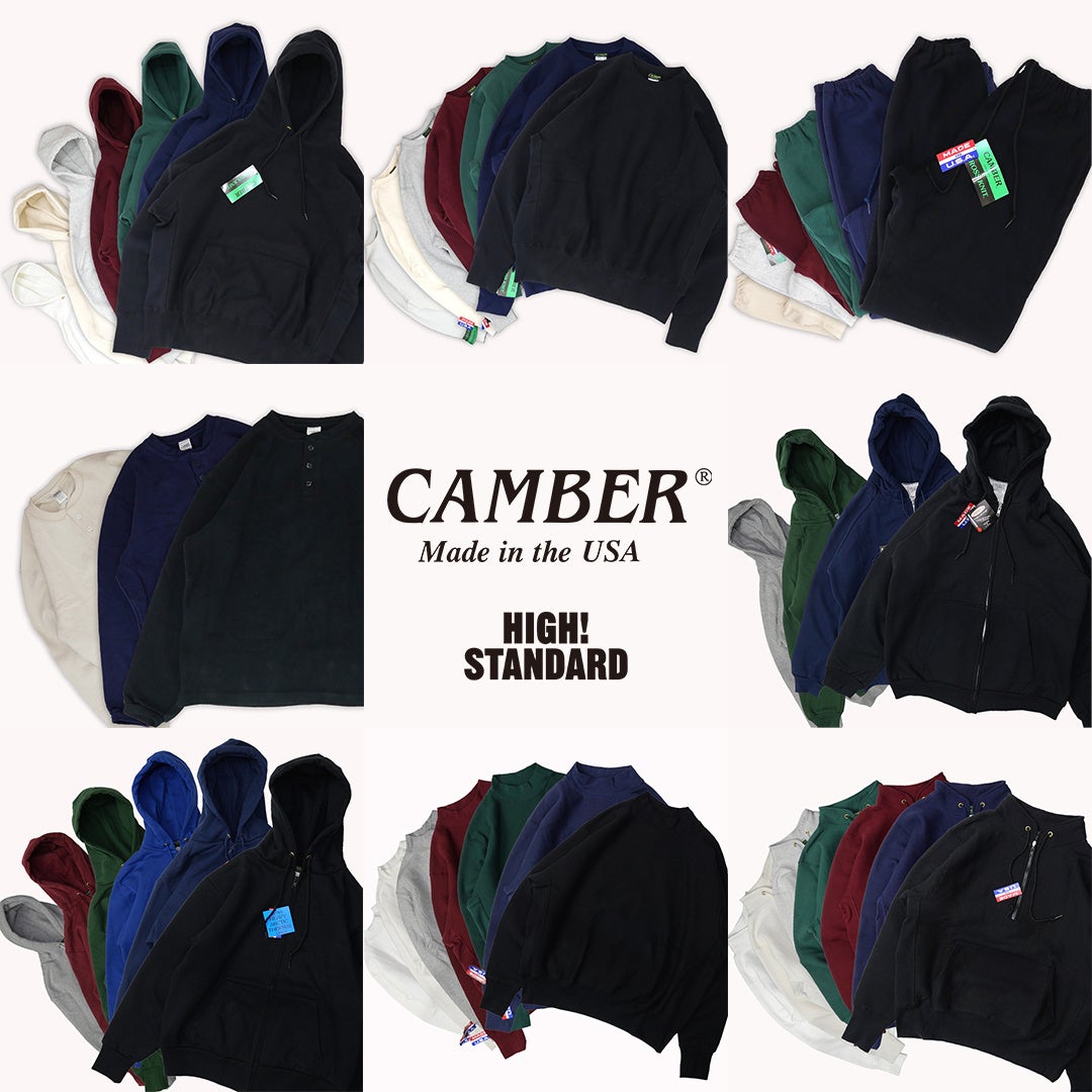 CAMBERは「Made in U.S.A.」にこだわり、ヘビーウェイトを一貫して追求しています。抜群の素材感を持つスウェットシャツやTシャツは、世界中で高い人気を誇ります。生産においてはもちろん、生地やパーツの細部に至るまでアメリカ製の素材を使用していることが特徴です。また、丈夫で長く着用でき、着込むことで体に馴染んでくる独特の着用感も魅力です。