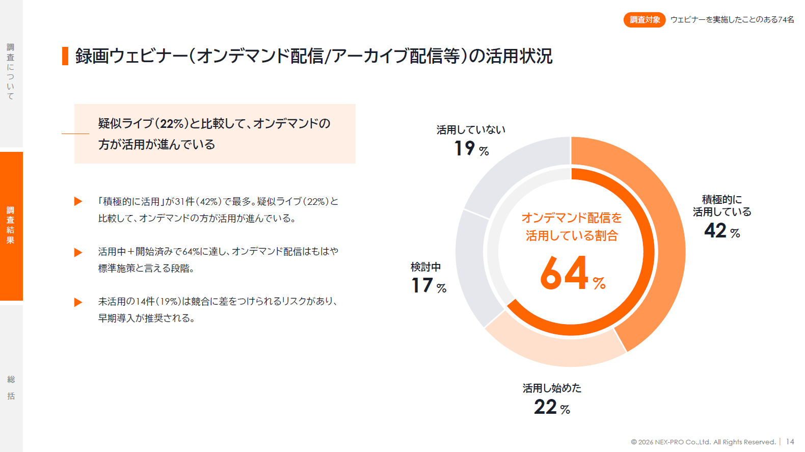 オンデマンド配信は64%の企業が活用しており、ウェビナー施策の中でも重要な位置づけとなっています。