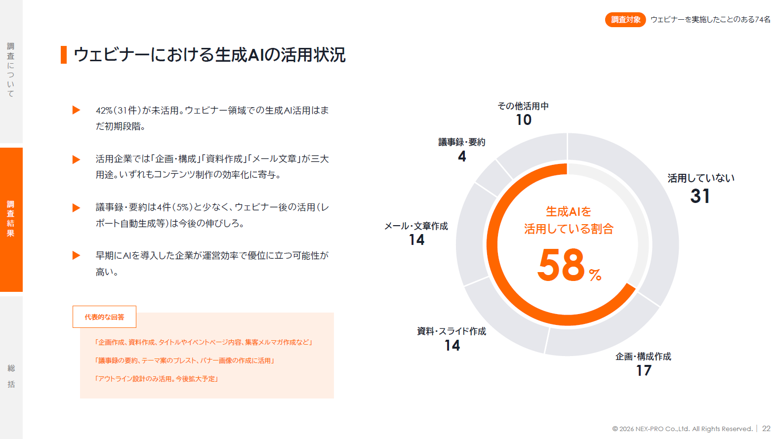 本調査から、ウェビナーの成果を高めるためには、単なる実施にとどまらず、運用全体の設計と活用の最適化が重要であることが明らかになりました。
