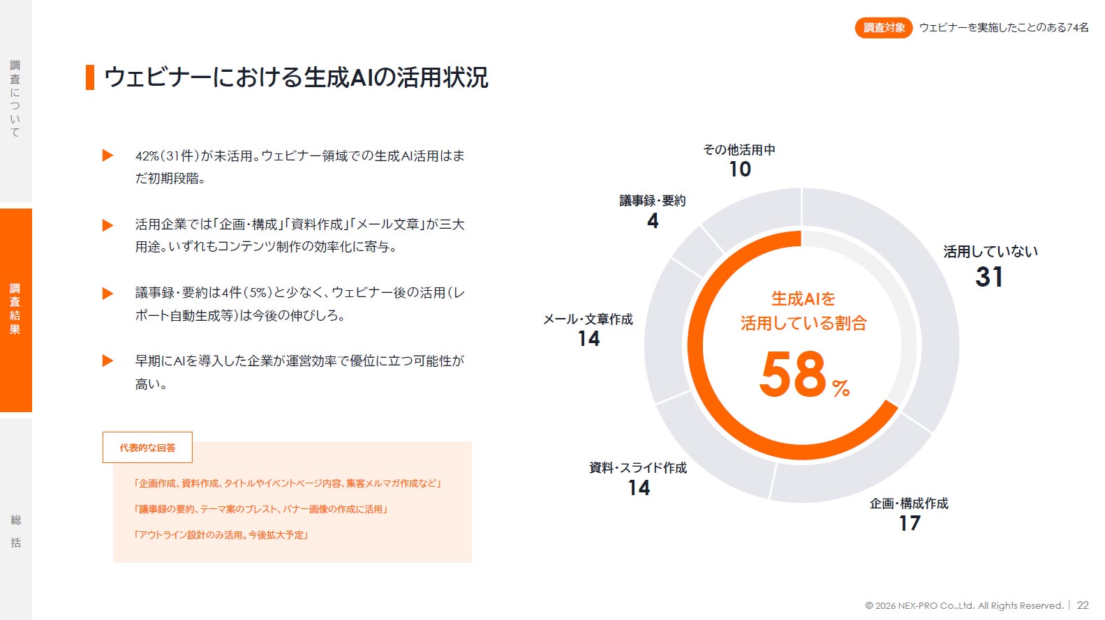 株式会社ネクプロ(本社:東京都千代田区、代表取締役:山田泰生)は、ウェビナーを実施または検討している企業102名を対象に実施した「2026年最新版 ウェビナーに関するアンケート調査結果」を公開いたしました。