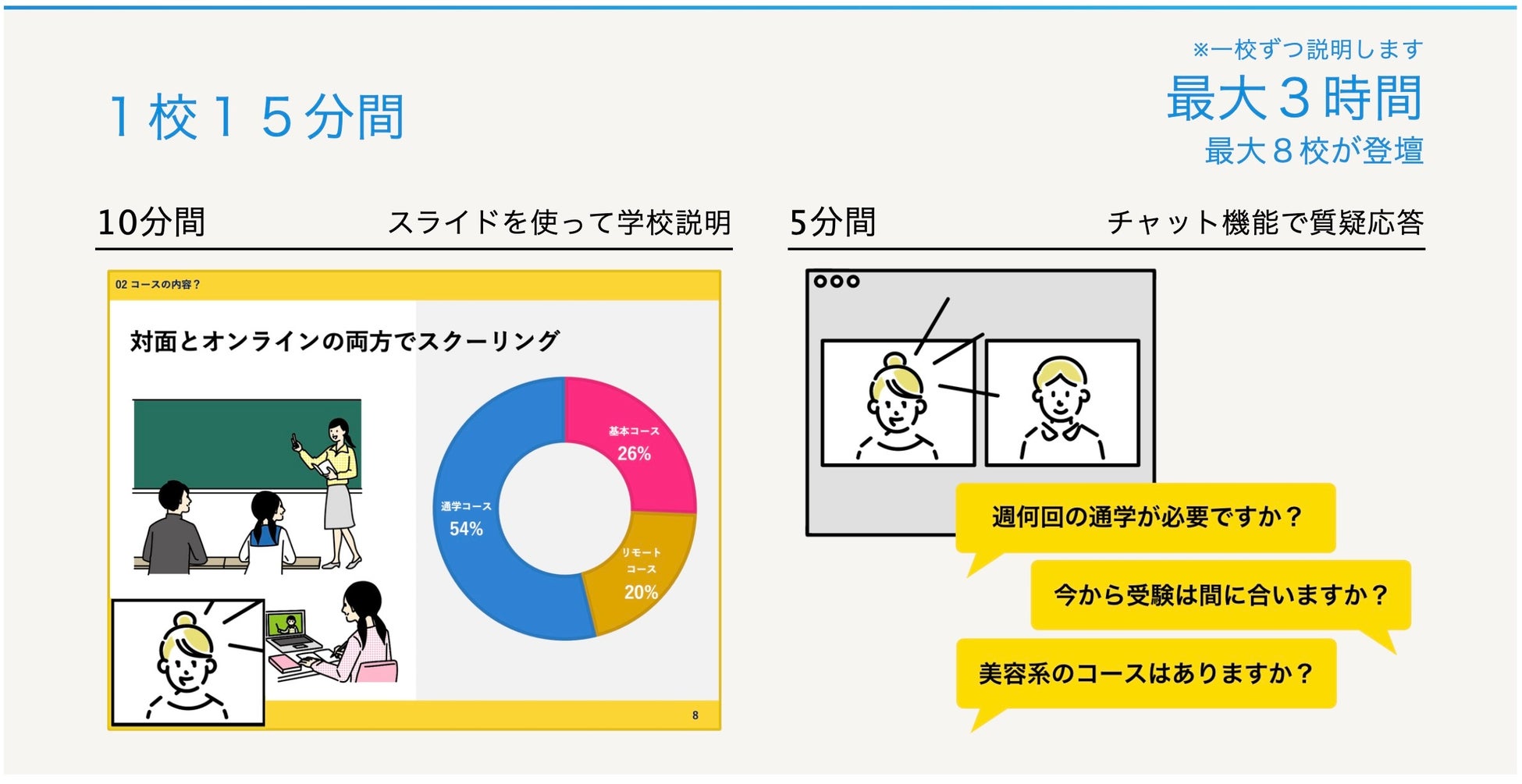 各エリアごとに最大8校の通信制高校・サポート校が登壇し、15分ずつのプレゼンテーションを行います。各校の特色、カリキュラム、サポート体制、進路実績などを直接比較することで、生徒や保護者が自分に最適な学校を効率的に選択できます。短時間で複数校の情報を効率的に収集でき、同一フォーマットでのプレゼンにより、各校の違いがよく分かるイベントとなっています。