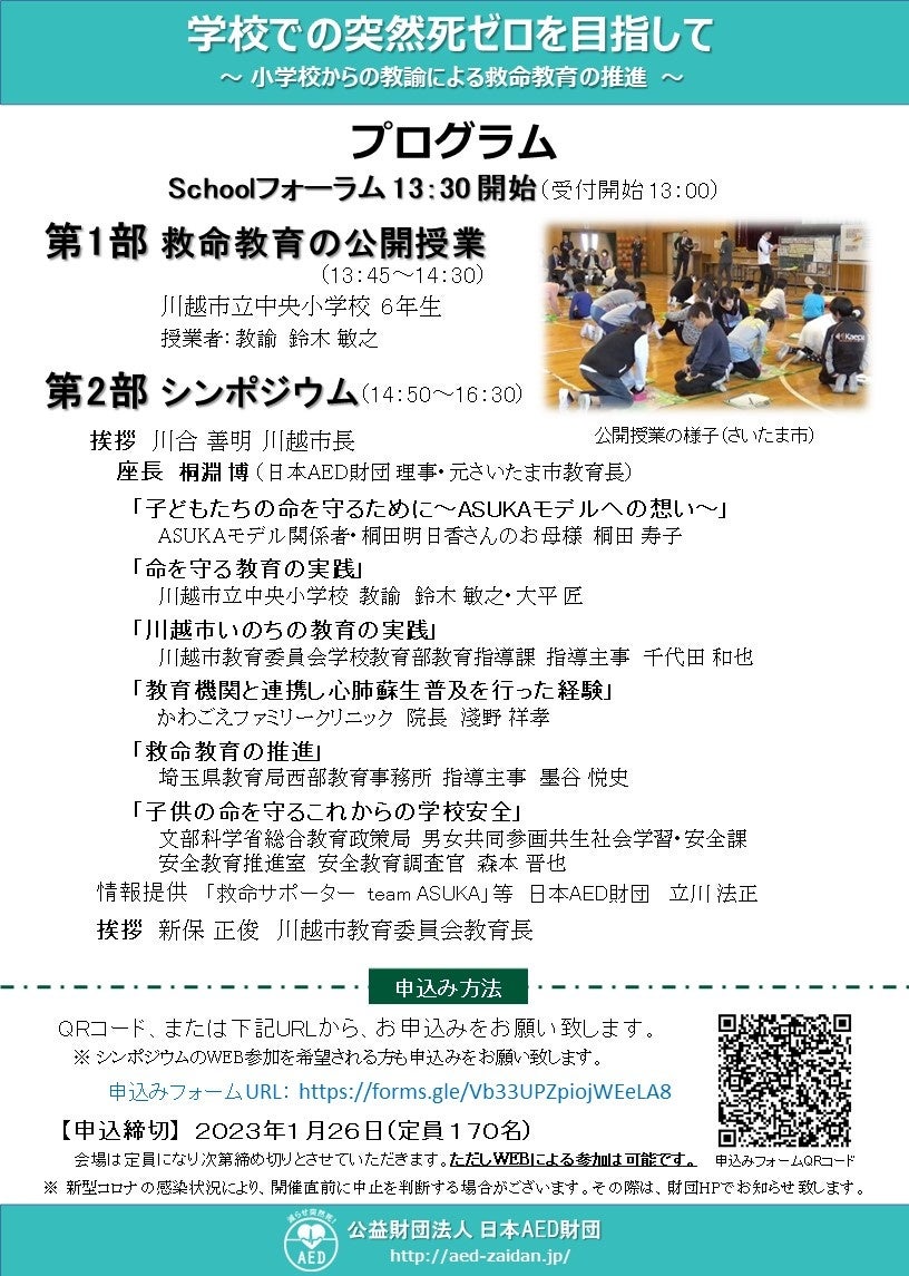 ※ 新型コロナウイルスの感染状況により、開催直前でも中止の判断をさせていただく場合があります。中止の際は、日本AED財団のホームページでお知らせ致します。