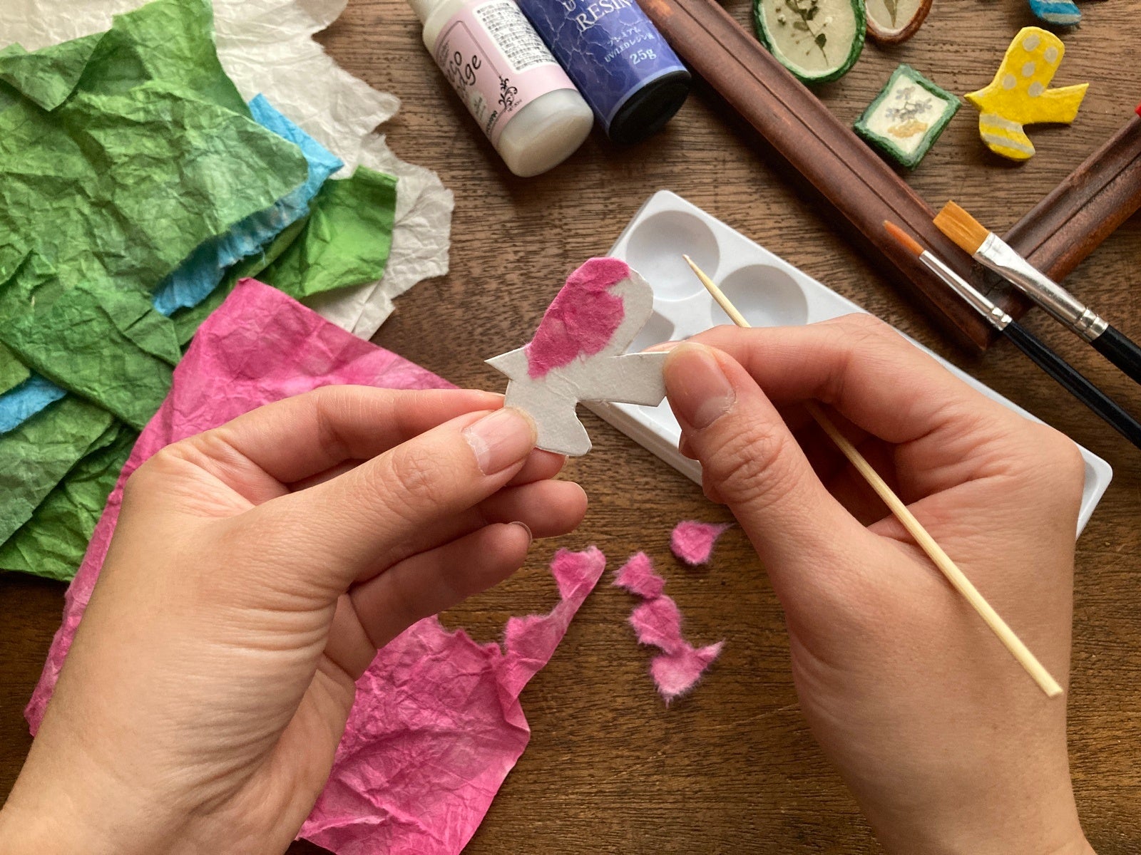 和風のイメージが強い和紙を使って、自分の好きなかわいいモチーフのアクセサリーを作るクラス。日本の伝統文化を時代に合わせた風を吹き込み、新しい和紙の楽しみ方を体験できます。