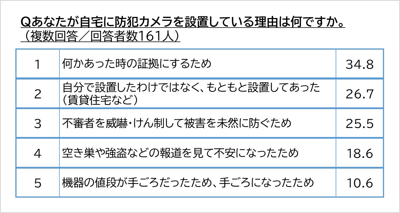 防犯カメラを設置している理由を尋ねたところ、「何かあったときの証拠にするため」(34.8%)が最も多く、「被害を未然に防ぐため」(25.5%)、「報道を見て不安になったため」(18.6%)と続きました。