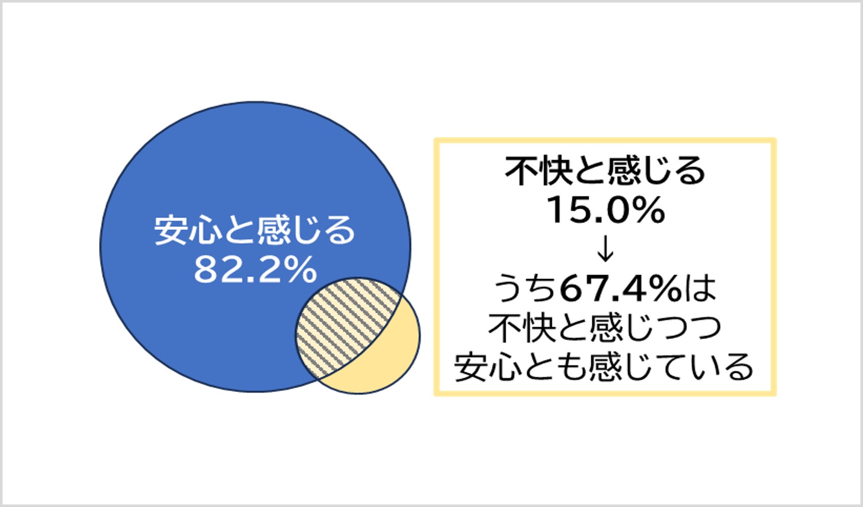 不快だと感じる15.0%の人の中で67.4%は安心とも感じている