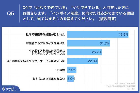 Q1で「かなりできている」「ややできている」と回答した方にお聞きします。「Q5.「インボイス制度」に向けた対応ができている要因として、当てはまるものを教えてください。(複数回答)」(n=101)と質問したところ、「社内で積極的な推進が行われた」が45.5%、「有識者からアドバイスを受けた」が31.7%、「インボイス制度に対応可能なシステムにリプレイスした」が25.7%という回答となりました。