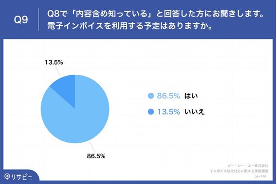 Q8で「内容含め知っている」と回答した方に、「Q9.電子インボイスを利用する予定はありますか。」(n=74)と質問したところ、「はい」が86.5%、「いいえ」が13.5%という回答となりました。