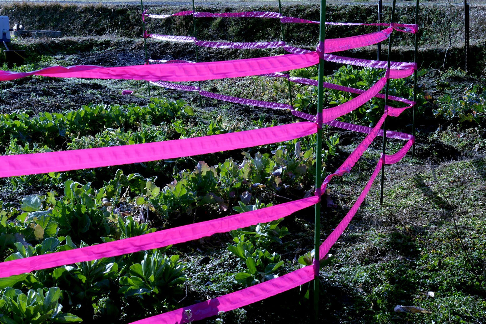 当社のテープ製造においては、OEM商品製造が約7割を占めていますが、この数年は自社開発力を活かしたオリジナル製品に力を入れています。害獣防止用の「来るなら濃いピンクテープ」は、濃い色が持続し交換の工数削減に貢献するとして人手不足や高齢化に悩む農業者の方々に支持をいただいています。昨年は、樹木被害対策や害獣被害対策用で微生物の力で分解される(※)生分解性テープ「土、帰るテープ」を上市、山林のゴミ問題にアプローチできると、多くのお問い合わせをいただいております。