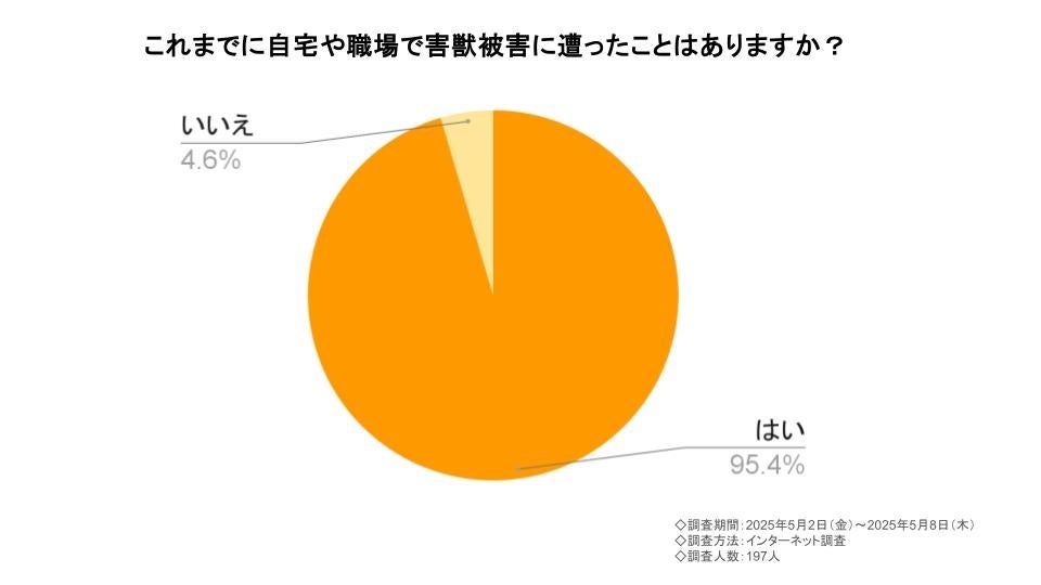 まず「これまでに自宅や職場で害獣被害に遭ったことはありますか?」(n=197)と質問したところ、188名(95.4%)から「はい」、9名(4.6%)から「いいえ」という回答が得られました。このことから、約9割の方が害獣被害に遭ったことがうかがえます。