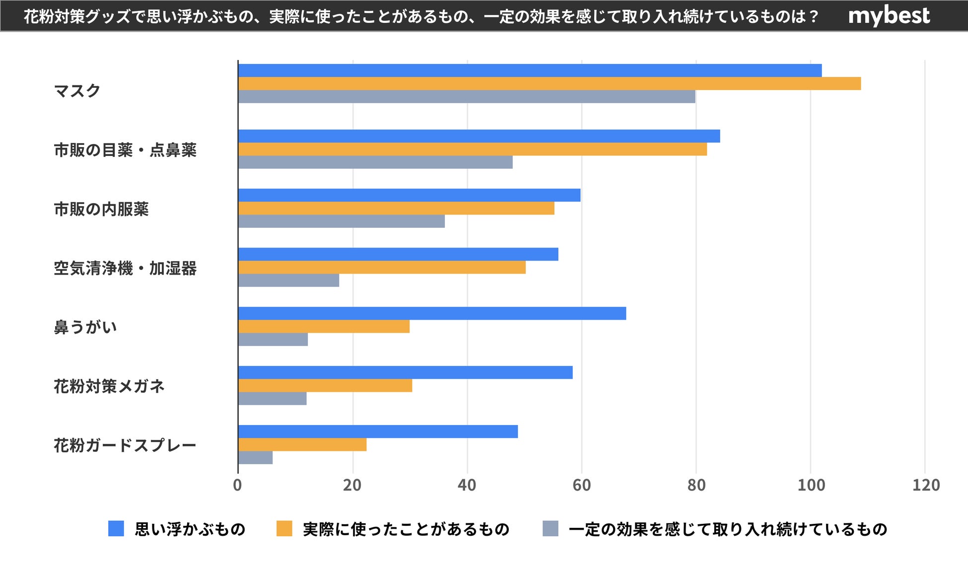 続いて、一般的な花粉対策グッズと呼ばれるもののうち、「思い浮かぶもの」と「実際に使ったことがあるもの」、「一定の効果を感じて取り入れ続けているもの」にギャップがあるかを調査。
