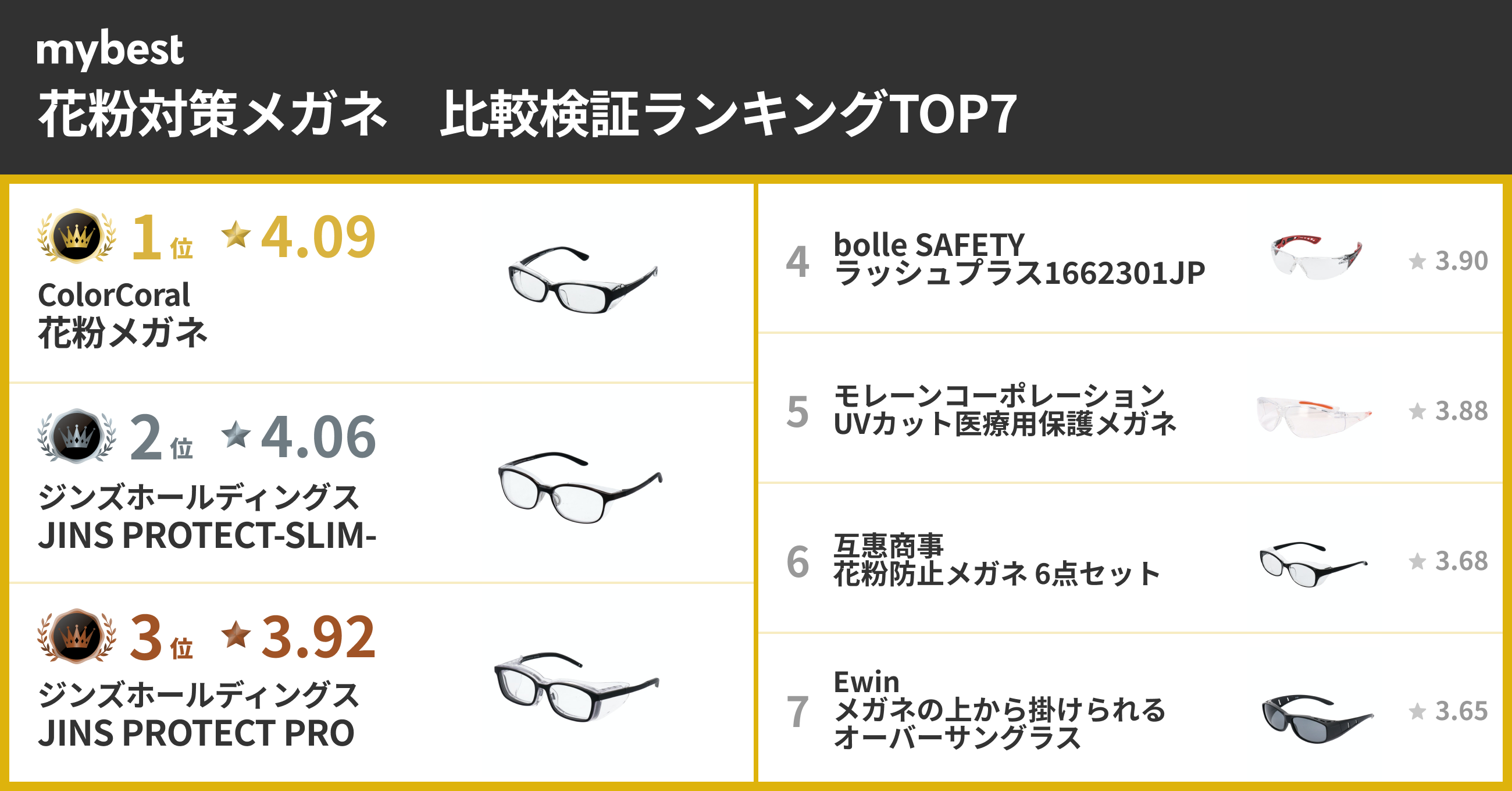 最後に、花粉対策メガネの総合評価ランキングTOP7をご紹介します。記事の中では、それぞれの花粉対策メガネの検証結果や詳しい評価ポイントも解説しています。
