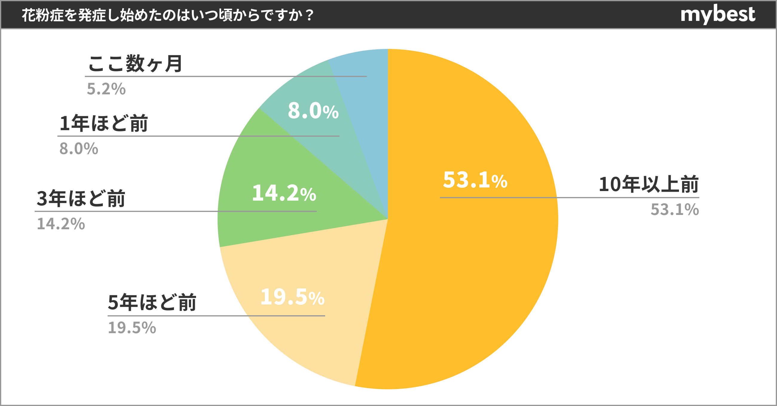 花粉症をいつ頃から発症したかを調査したアンケートでは、過半数以上の53.1%が「10年以上前に発症」と回答。