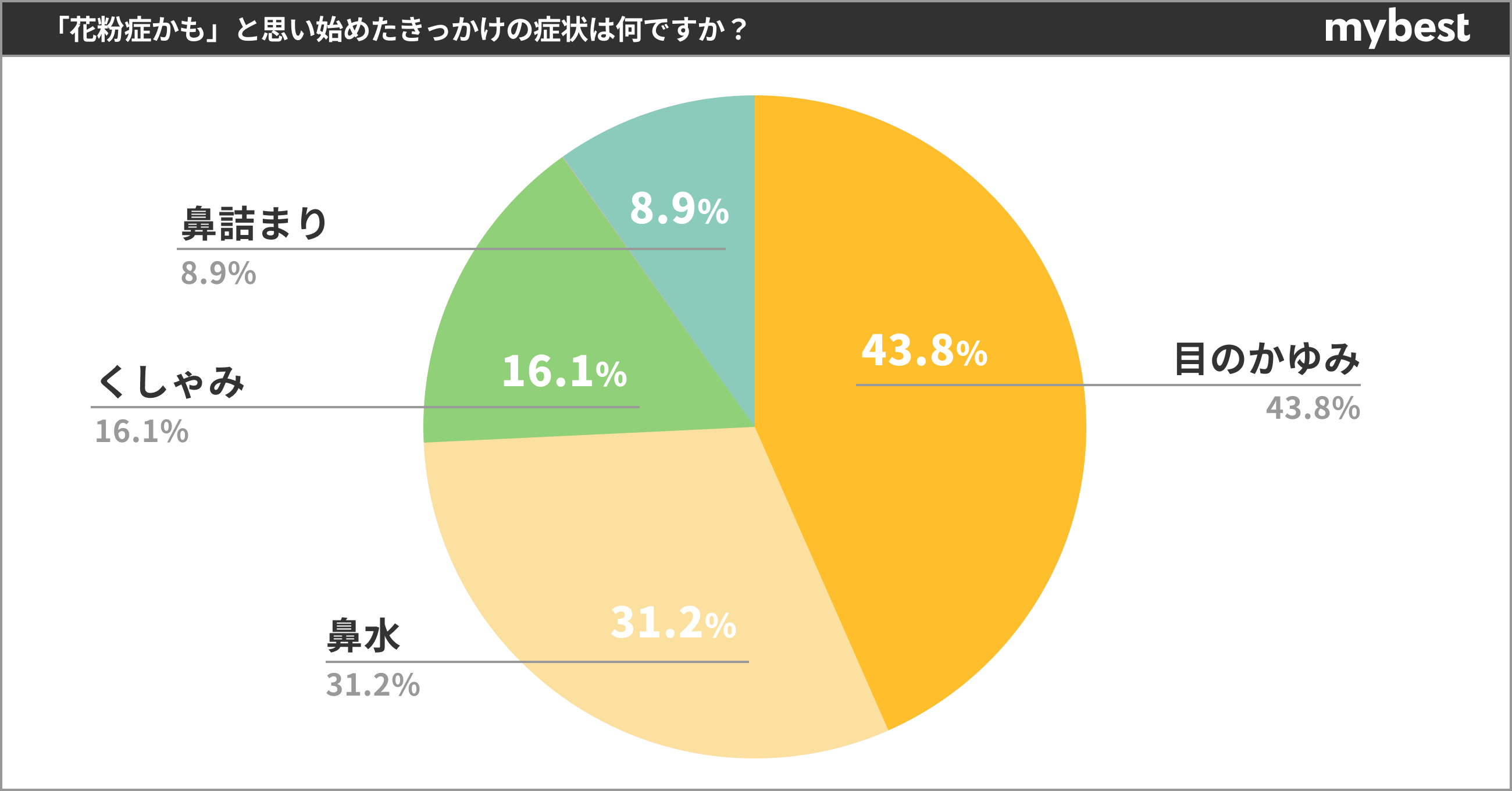 次いで「鼻水」が31.2%、「くしゃみ」が16.1%、「鼻詰まり」が8.9%という結果になりました。