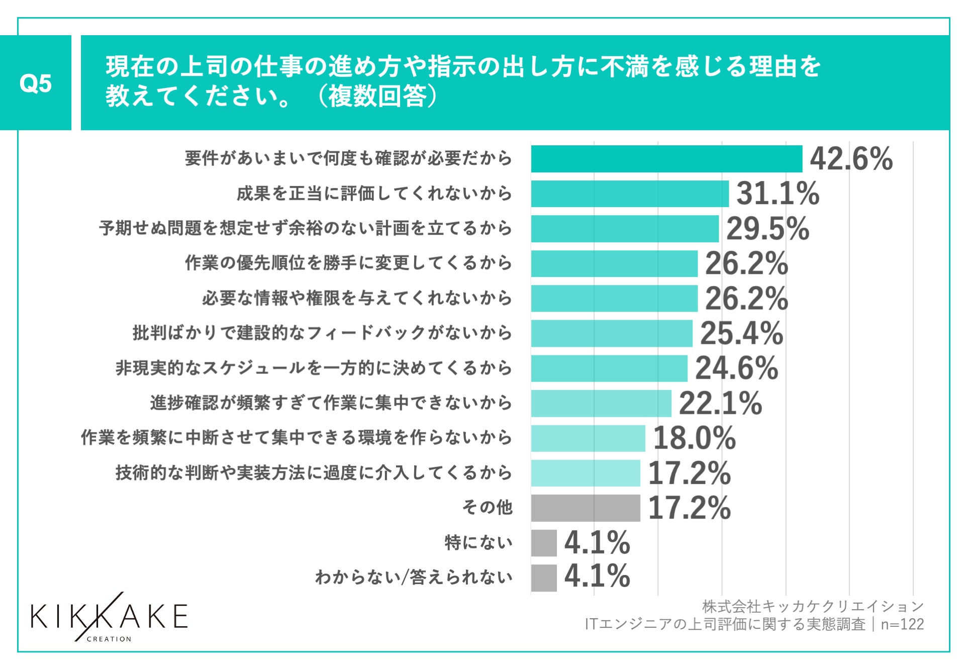 Q2で「やや不満である」「非常に不満である」と回答した方に、「Q5.現在の上司の仕事の進め方や指示の出し方に不満を感じる理由を教えてください。(複数回答)」(n=122)と質問したところ、「要件があいまいで何度も確認が必要だから」が42.6%、「成果を正当に評価してくれないから」が31.1%、「予期せぬ問題を想定せず余裕のない計画を立てるから」が29.5%