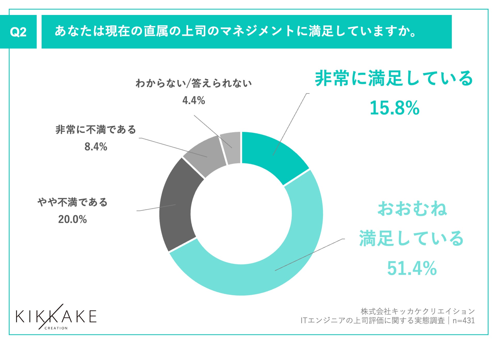 「Q2.あなたは現在の直属の上司のマネジメントに満足していますか。」(n=431)と質問したところ、「非常に満足している」が15.8%、「おおむね満足している」が51.4%という回答となりました。