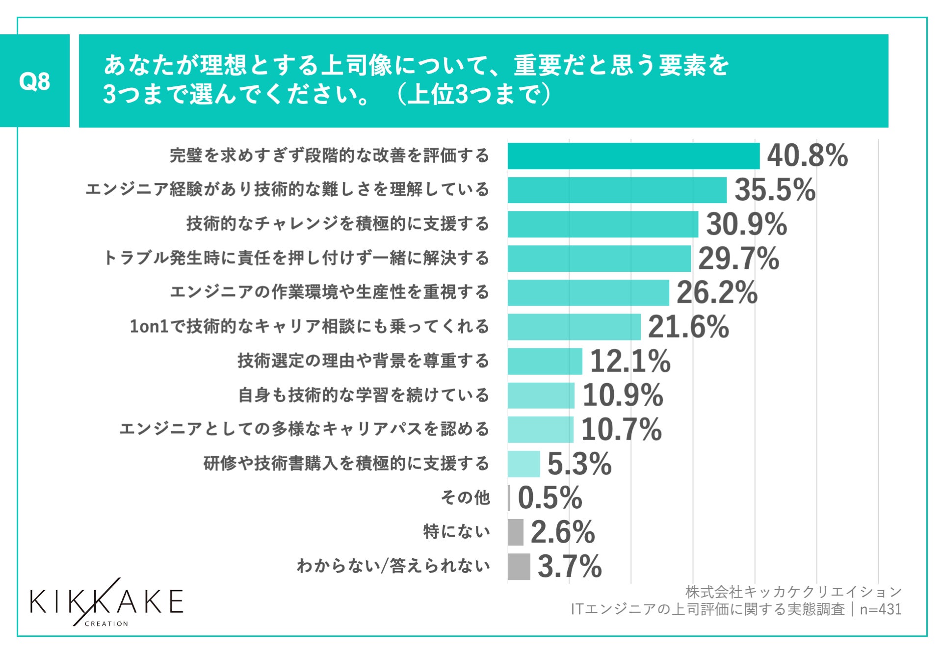 「Q8.あなたが理想とする上司像について、重要だと思う要素を3つまで選んでください。(上位3つまで)」(n=431)と質問したところ、「完璧を求めすぎず段階的な改善を評価する」が40.8%、「エンジニア経験があり技術的な難しさを理解している」が35.5%、「技術的なチャレンジを積極的に支援する」が30.9%という回答となりました。