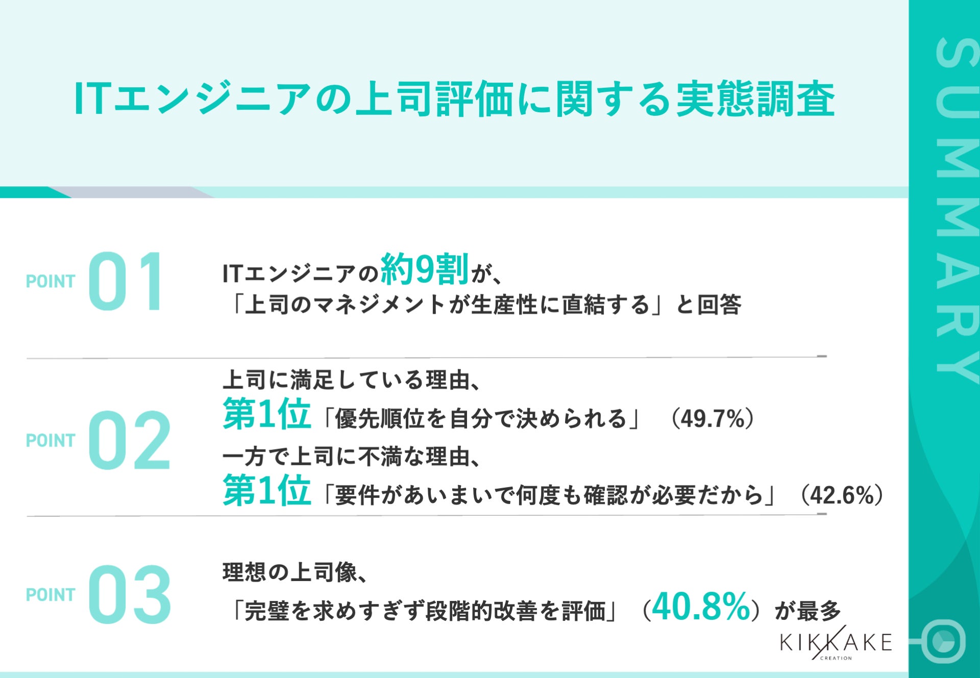 株式会社キッカケクリエイション(本社:東京都渋谷区、代表取締役:川島 我生斗)は、直属の上司がいるITエンジニア431名を対象に、ITエンジニアの上司評価に関する実態調査を実施しましたので、お知らせいたします。