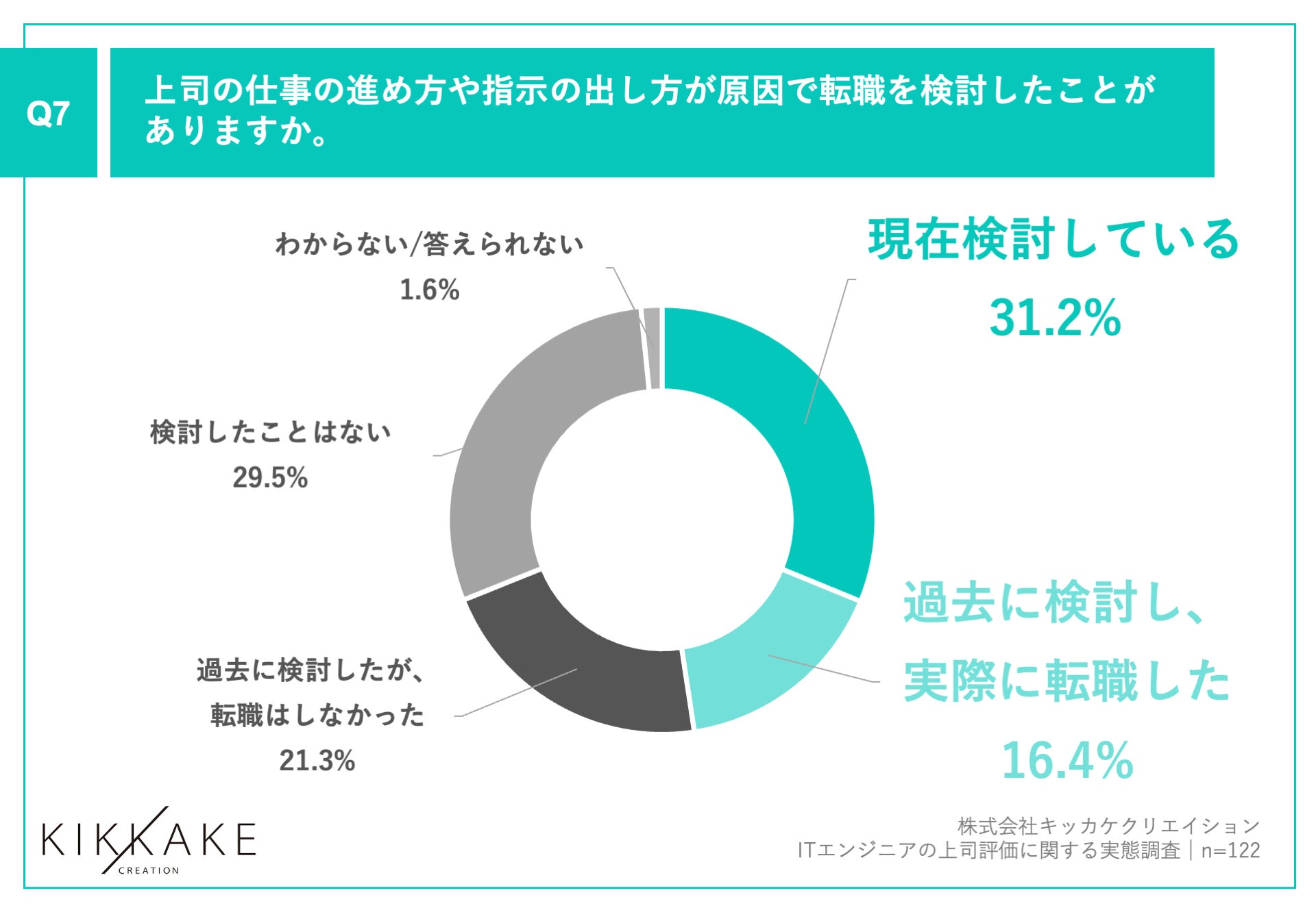 Q2で「やや不満である」「非常に不満である」と回答した方に、「Q7.上司の仕事の進め方や指示の出し方が原因で転職を検討したことがありますか。」(n=122)と質問したところ、「現在検討している」が31.2%、「過去に検討し、実際に転職した」が16.4%という回答となりました。