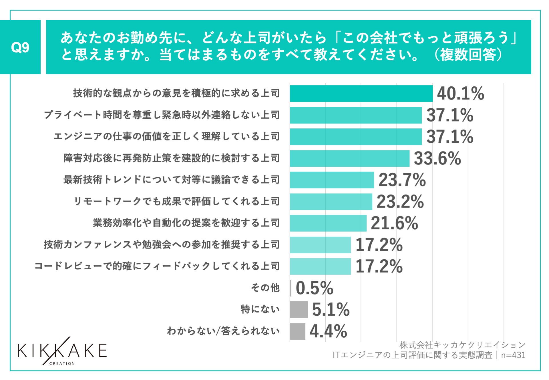 「Q9.あなたのお勤め先に、どんな上司がいたら「この会社でもっと頑張ろう」と思えますか。当てはまるものをすべて教えてください。(複数回答)」(n=431)と質問したところ、「技術的な観点からの意見を積極的に求める上司」が40.1%、「プライベート時間を尊重し緊急時以外連絡しない上司」が37.1%、「エンジニアの仕事の価値を正しく理解している上司」が37.1%という回答となりました。