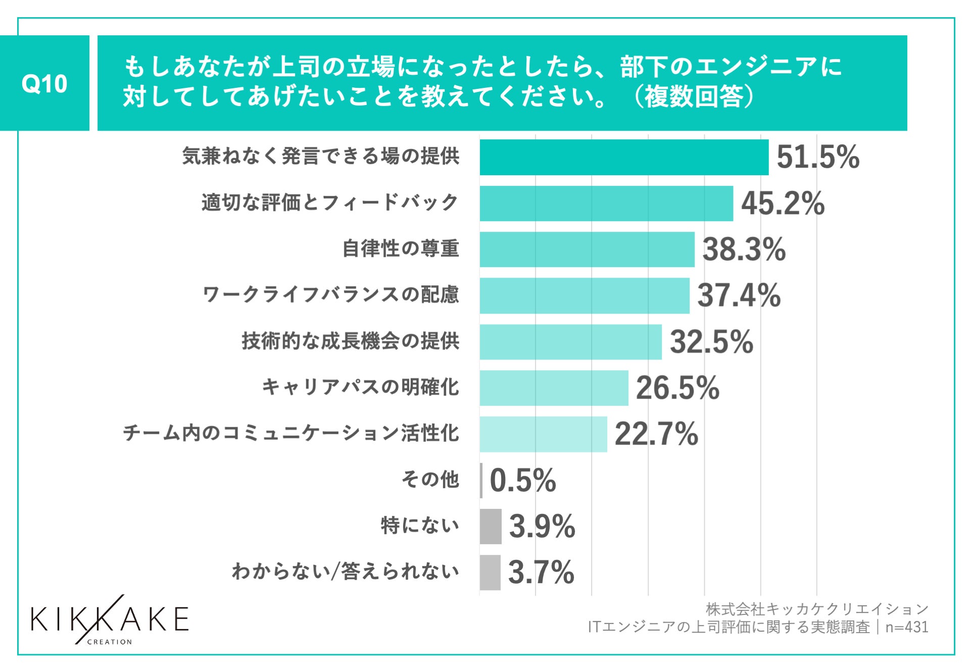 「Q10.もしあなたが上司の立場になったとしたら、部下のエンジニアに対してしてあげたいことを教えてください。(複数回答)」(n=431)と質問したところ、「気兼ねなく発言できる場の提供」が51.5%、「適切な評価とフィードバック」が45.2%、「自律性の尊重」が38.3%という回答となりました。