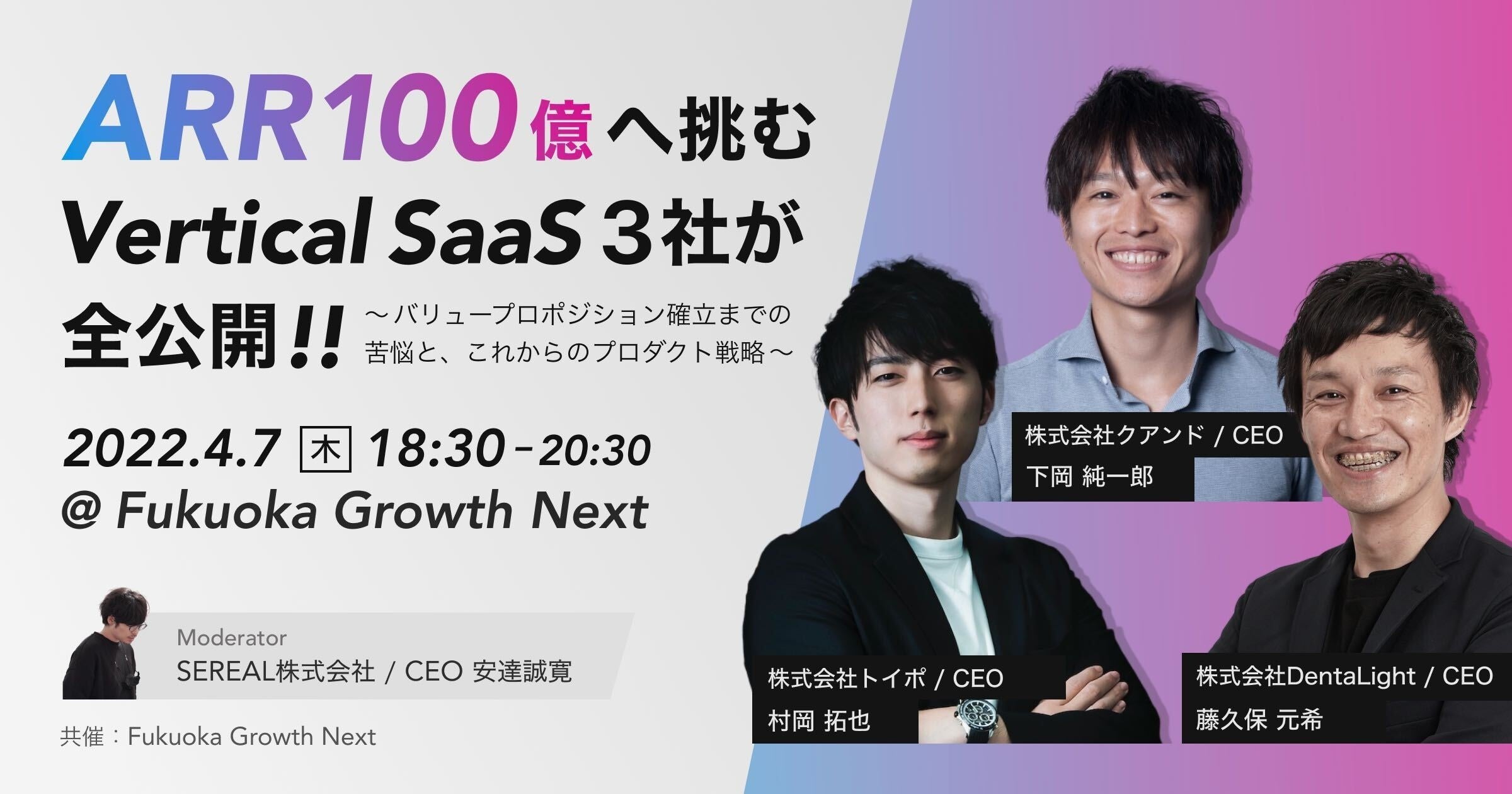 福岡を拠点としてARR100億へ挑むスタートアップ3社が、Vertical SaaSとして、それぞれの業界でどのようにして、バリュープロポジションの確立に至ったのか。そこに至るまでの苦悩や決断、0から新しい価値を生み出すことの喜び、ARR100億を達成するための今後のプロダクト戦略などを、各社の創業者が赤裸々に語るイベントです。