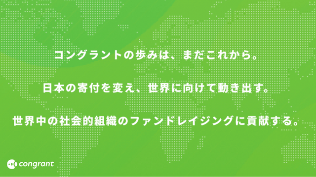 NPO・非営利団体のためのデジタル・ファンドレイジングシステム「congrant(コングラント)」はNPOの寄付募集・決済・CRMなどNPO運営に必要なすべてをワンストップで提供。導入団体は1,300団体以上、寄付流通金額は29億円を突破。世界中の社会的組織のファンドレイジングに貢献するソーシャルカンパニー。