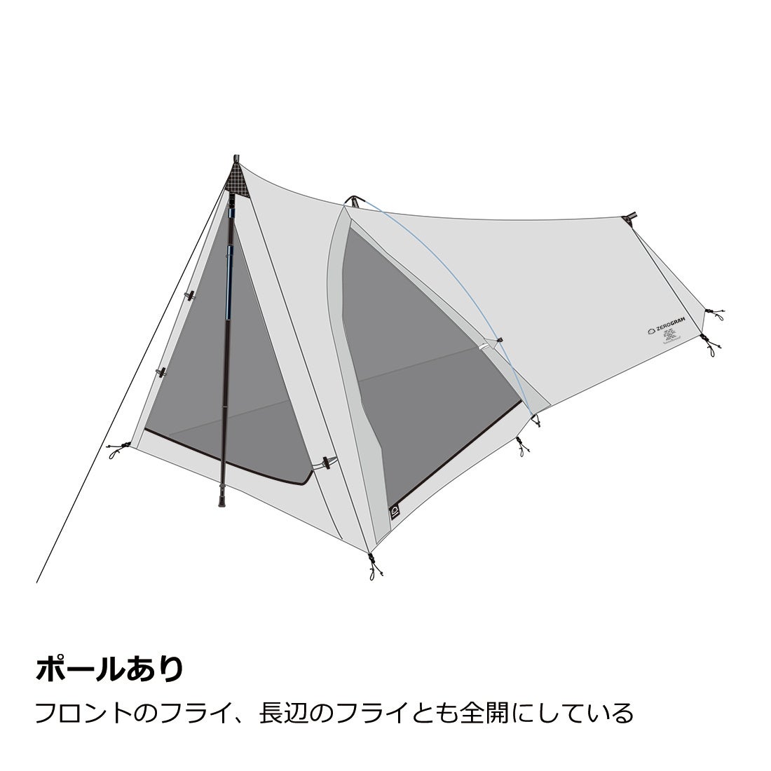 本商品は「Beyond Trekking Pole Shleter」をコンセプトに、日本の山岳環境と高湿度への対策を施しました。シェルター本体のみでもZEROGRAMらしい快適な空間に。さらに専用DACポールを本体に付ければ居住空間を120%利用しながら自立型テントのような安定性が得られます。