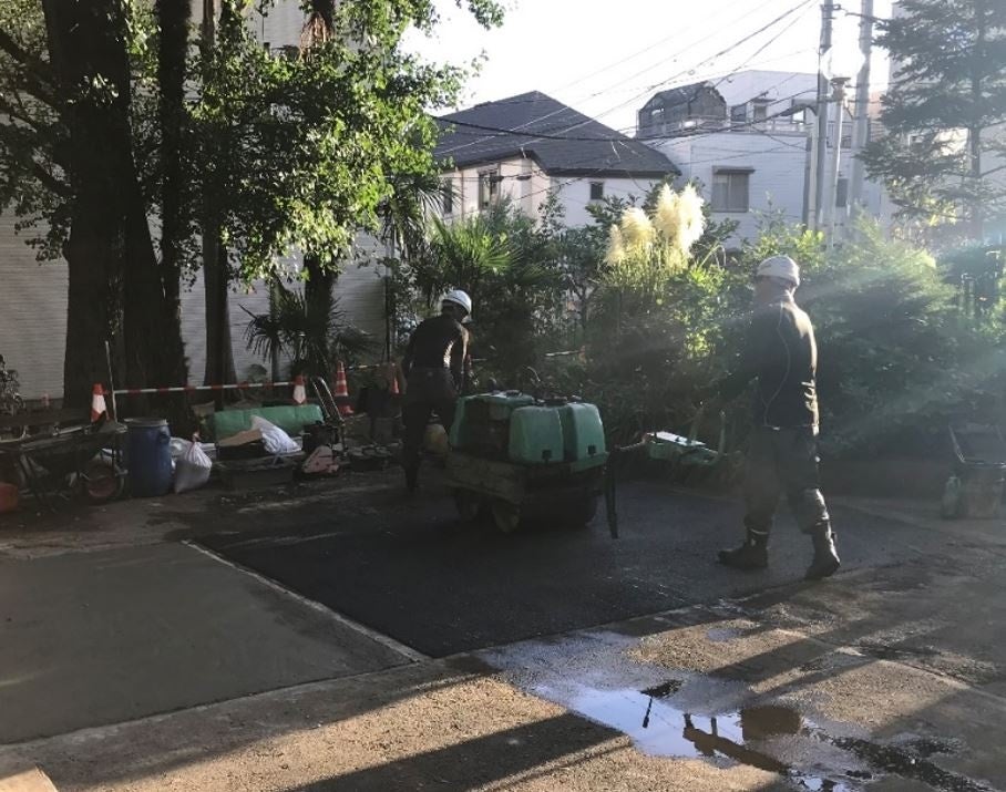 今回、東京都の低炭素(中温化)アスファルト混合物早期試験施工に至ったのは、小池百合子都知事と野口貴文東京大学教授の道路インフラにおけるCO2削減等対談の際に、都知事から紹介があったことによる。(https://youtu.be/wYi95MLP9rs) 野口教授が代表理事を務めるRRCS(一般社団法人 生コン・残コンソリューション技術研究会)会員である株式会社内山アドバンス(社長=柳内光子氏、千葉県市川市)から提供された学校法人草苑学園(理事長=柳内光子氏、豊島区)駐車場に、同じくRRCS会員の大成ロテック株式会社(社長=西田義則氏、新宿区)の合材工場にて製造した低炭素(中温化)アスファルト混合物を適用した。施工を担当したのは徳力建設工業株式会社(社長=鳥越雅人氏、豊島区)。施工確認した鳥越社長は「夏の暑い時期の舗装工事における作業環境改善にも期待できる」と述べた。