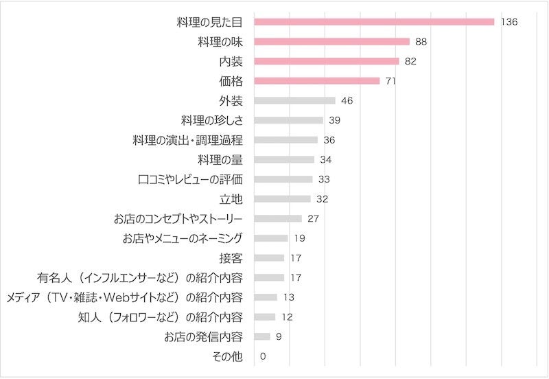 ・写真が映えるには、美味しそうで綺麗な見た目が最も重要だからです。映えだけを意識するのであれば、派手な見た目で味がそこそこな料理でもいいかなと思います。(20代女性)