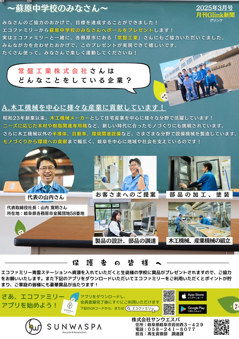 岐阜市、各務原市、関市、山県市の中学校で「ぐりんく」がスタートしています。常盤工業株式会社(所在地:岐阜県各務原市、代表取締役社長:山内寛明)が蘇原中学校(所在地:岐阜県各務原市)にサッカーボールやバレーボールを寄贈。ぐりんく新聞が778人の全校生徒に配布され、企業の地元認知度の向上やSDGsの目標達成にも貢献しました。