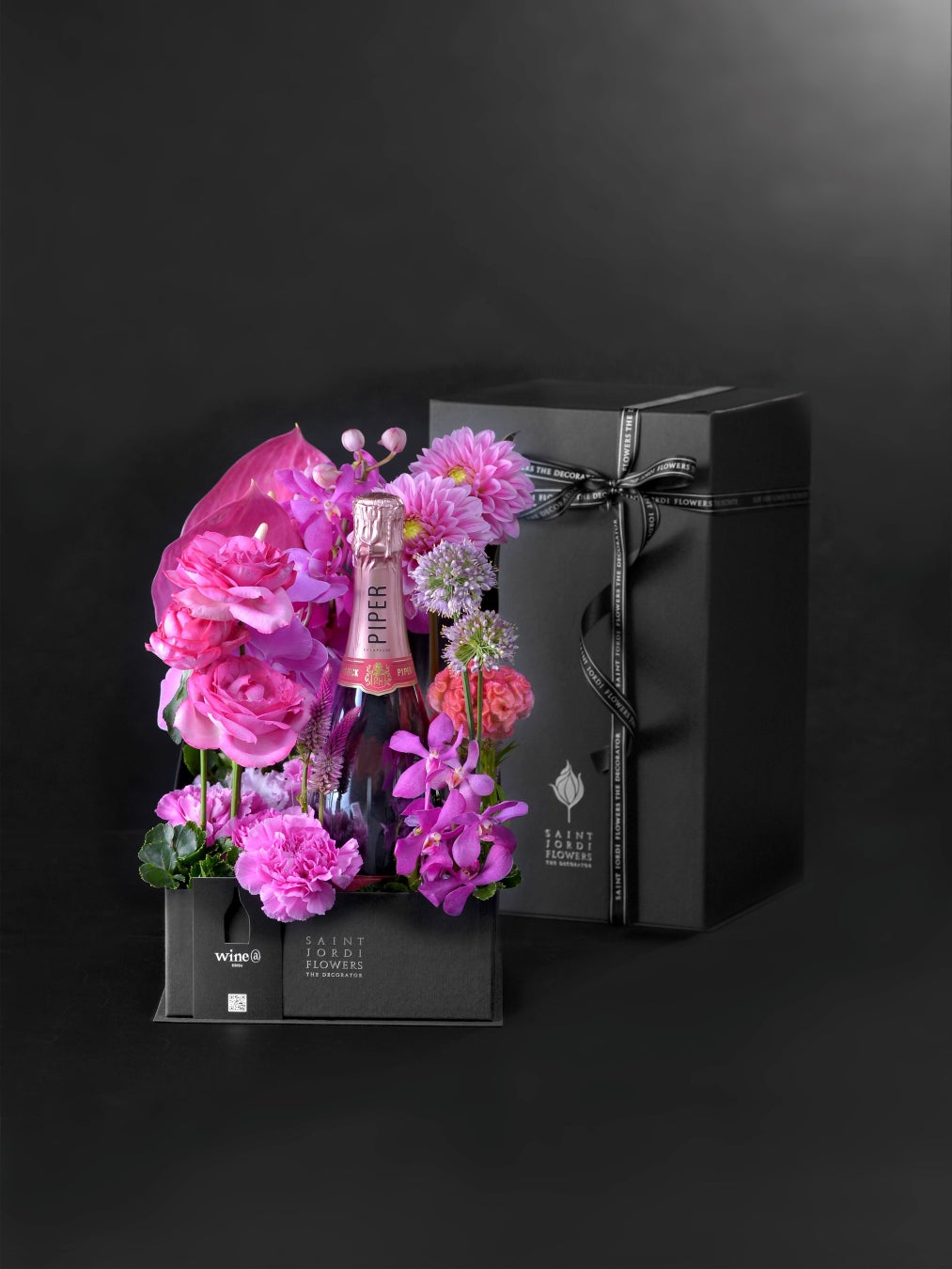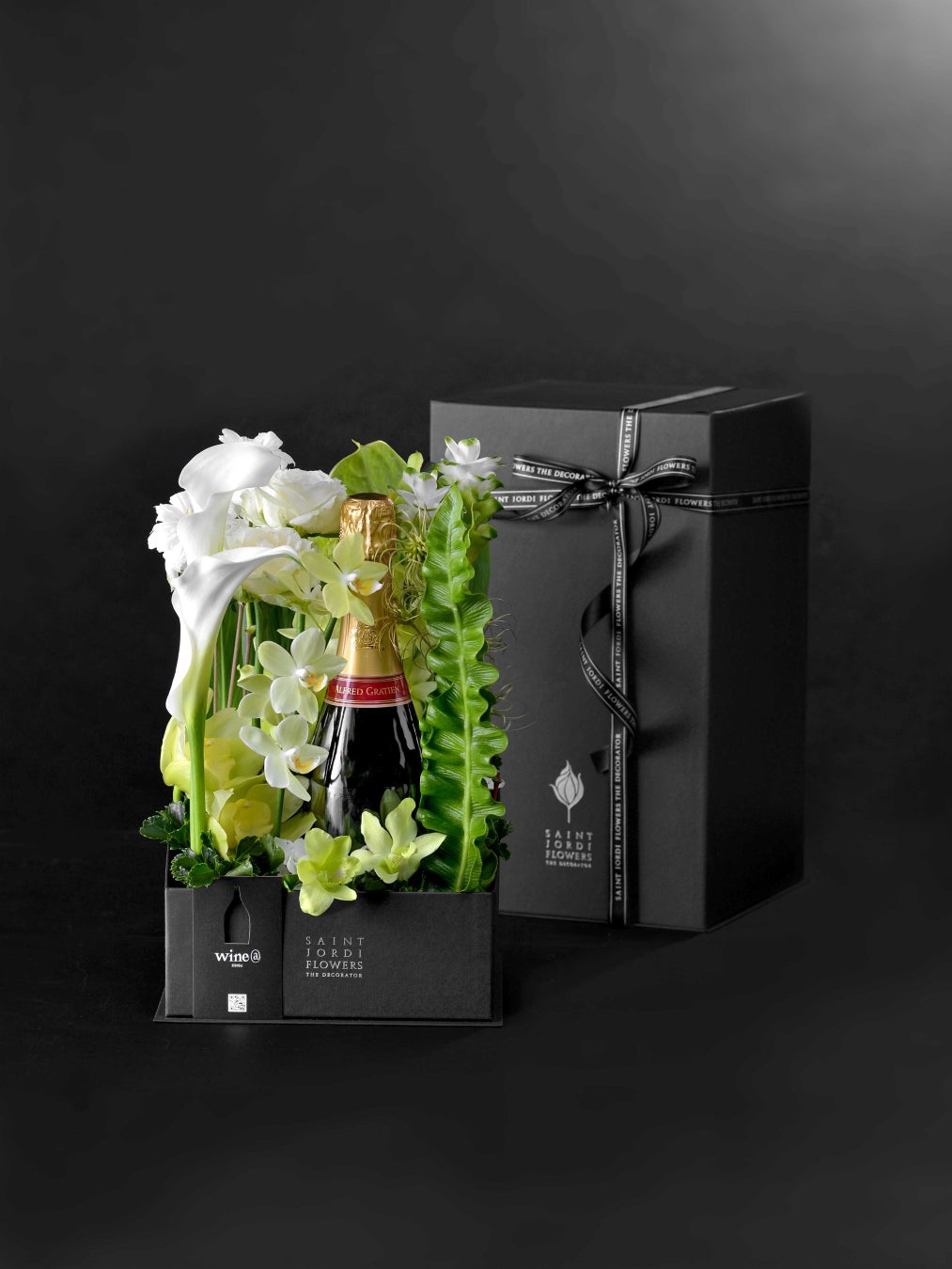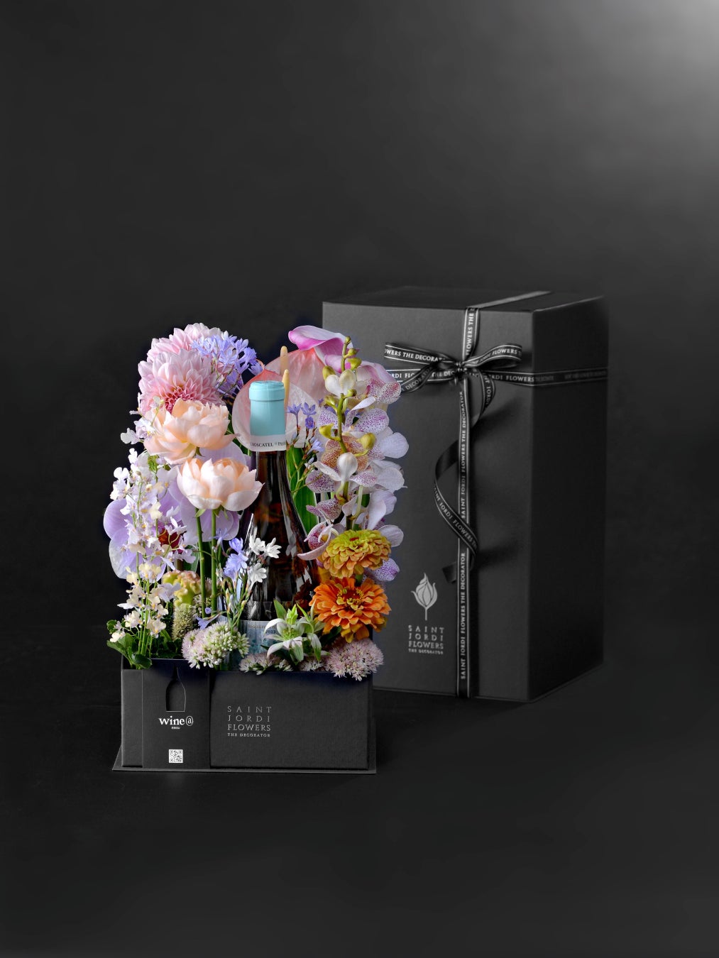 “ワインアットのソムリエ”が、香りや味わい、ストーリー、お花との相性を考え、大切な人への贈り物を想像してワインを厳選。そのワインが持つ個性からインスピレーションを受けた“サンジョルディフラワーズ ザ・デコレーター”のフラワーデコレーターが、花でワインに彩りを添えて仕立て上げるワイン入りフラワーボックス。私たちだからお届けできる、大切な人の感性に触れる、思いを結ぶギフトです。