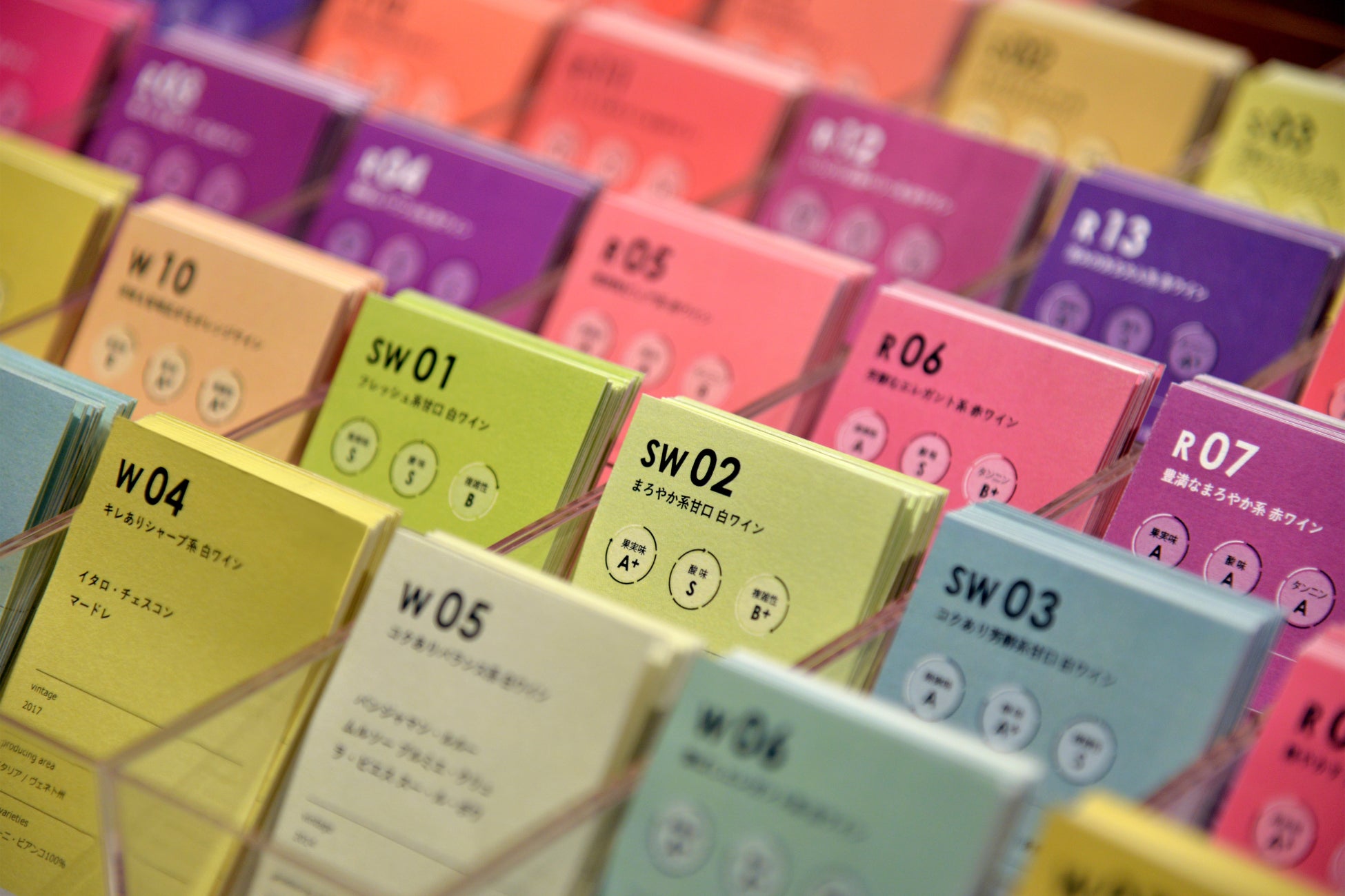 wine@では、ワインの複雑な味わいを分かりやすく表現するために、「ワイン味わいマップ」を開発。全世界のワインを白13タイプ、赤13タイプ、ロゼ4タイプ、スパークリング8タイプに分類して、色分け、可視化しました。ワインに詳しくないユーザーでも自分のワインの好みを簡単に表現できるようになっています。