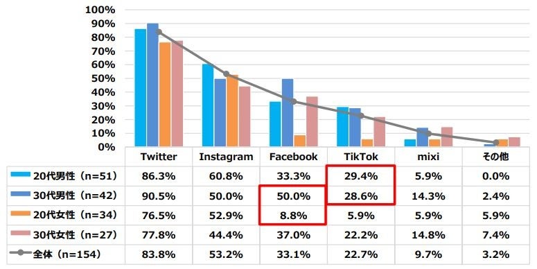 「Facebook」は20代女性が8.8%、30代男性が50.0%、「TikTok」は20代~30代男性の約3割が利用。