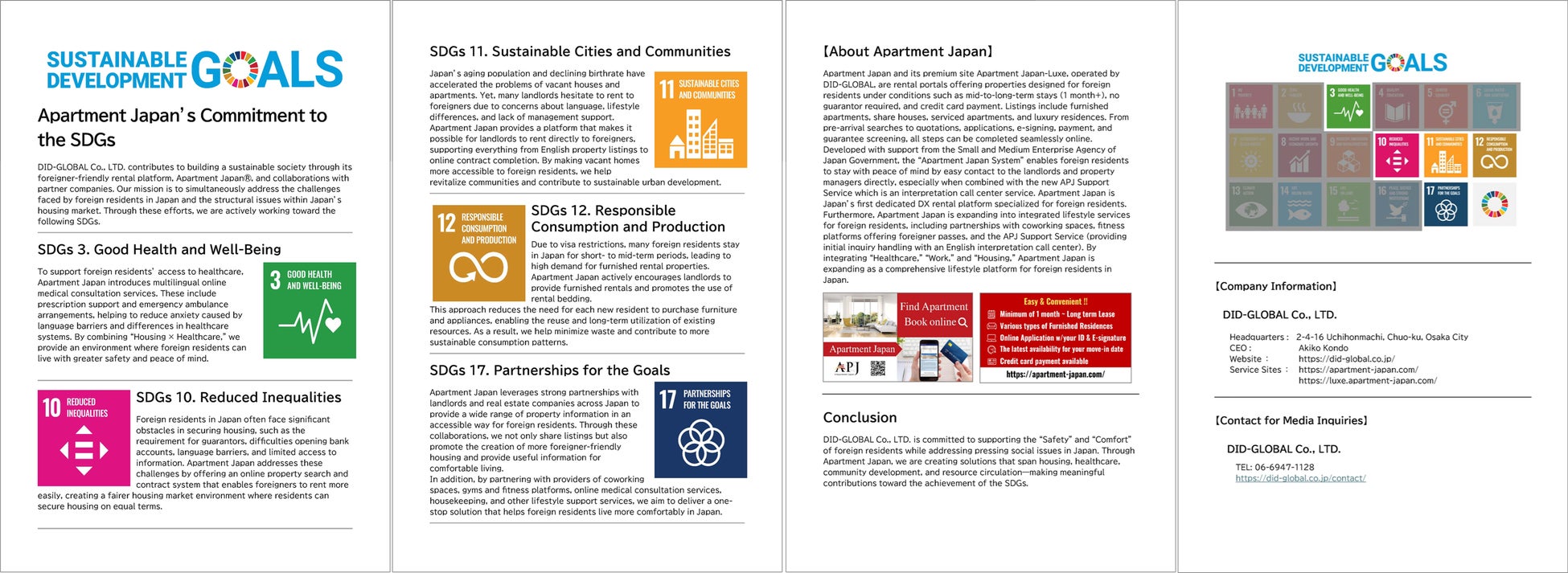 DID-GLOBAL株式会社は、外国人の安心・快適な生活を支えると同時に、日本の社会課題解決にも資する仕組みづくりを進めています。Apartment Japanの活動は、住まい・健康・地域社会・資源循環といった多方面にわたり、SDGsの実現に向けて大きく貢献していきます。
