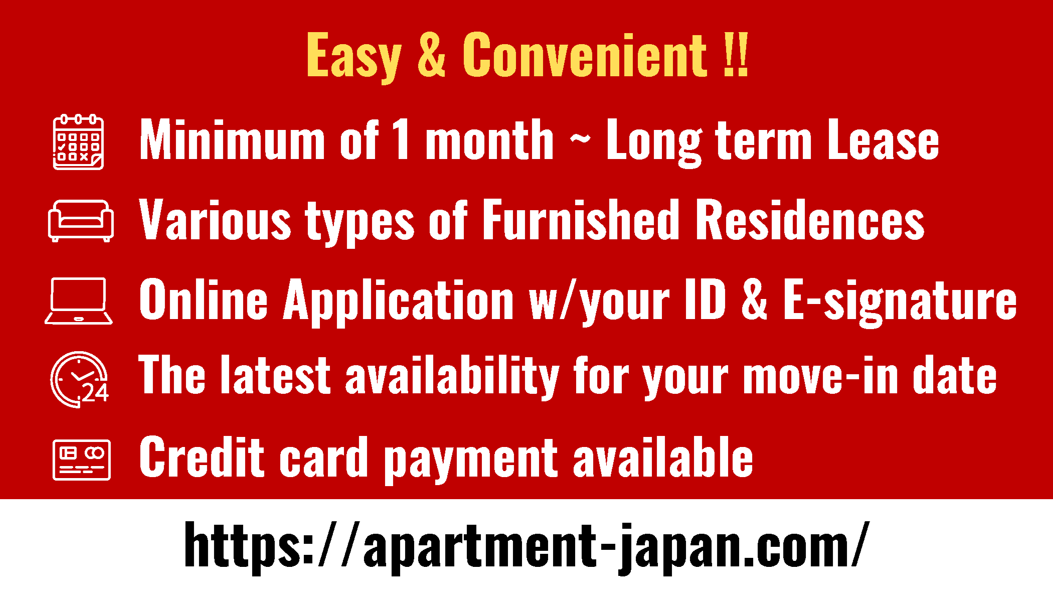 DID-GLOBAL株式会社が運営する「Apartment Japan」および「Apartment Japan-Luxe」は、外国人フレンドリーな条件(1ヶ月以上の中長期契約、保証人不要、クレジットカード決済対応など)で多様な物件を掲載する賃貸ポータルサイトです。家具付きマンション、シェアハウス、サービスアパートメント、ラグジュアリー物件などを幅広く掲載し、来日前からオンラインで物件検索、見積取得、申込、電子署名による契約、支払い、保証審査までをワンストップで完結できます。