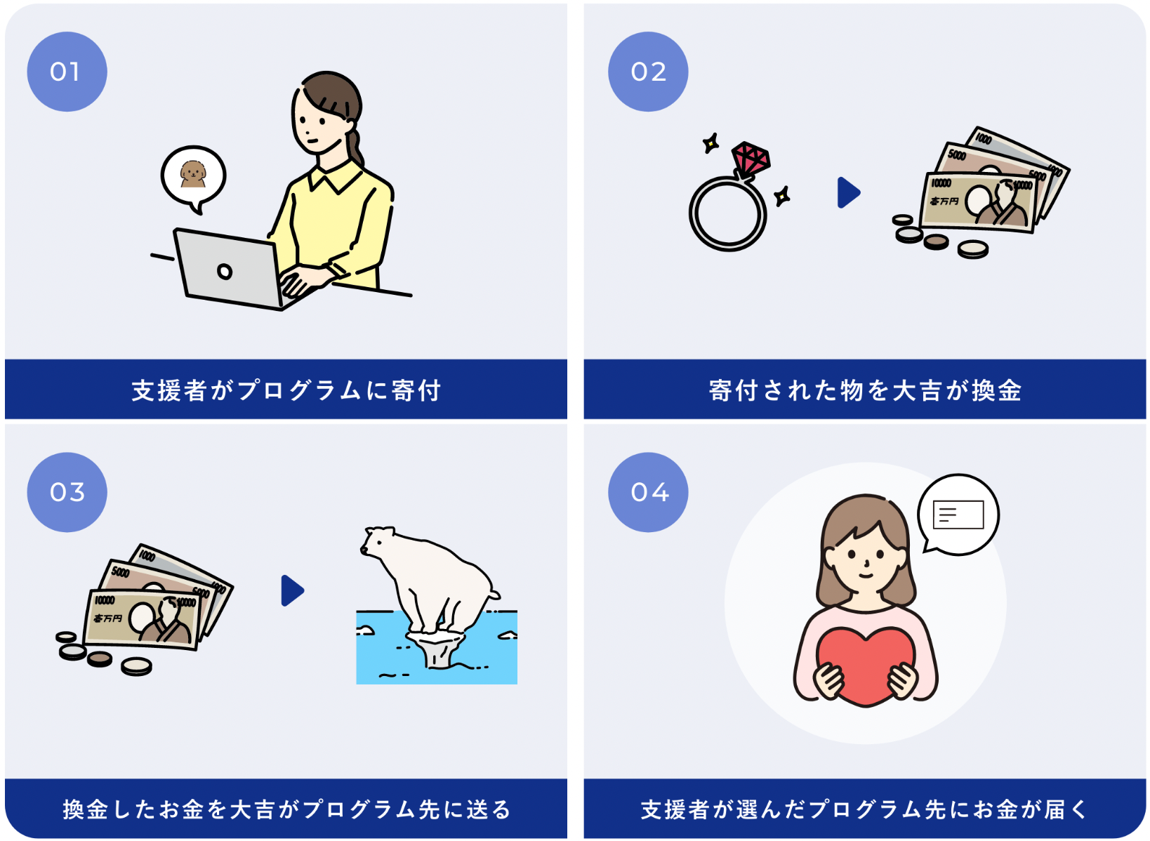 使わなくなったモノを出張買取でお金に変えて寄付することができます。さらに寄付額の10%が買取大吉から上乗せされて支援に回されます。